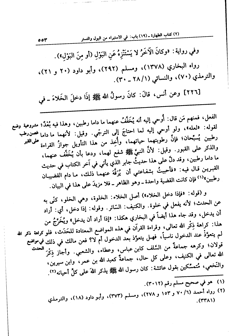 [226] وَعَن أَنَسٍ؛ قَالَ: كَانَ رَسُولُ اللهِ - صلى الله عليه وسلم - إِذَا دَخَلَ الخَلاءَ - فِي
