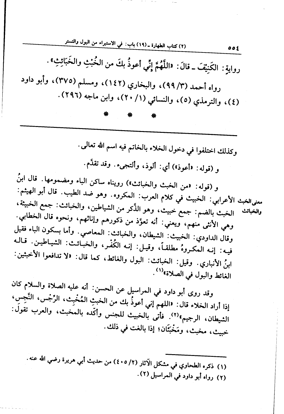 رِوَايَةٍ: الكَنِيفَ - قَالَ: اللهُمَّ إِنِّي أَعُوذُ بِكَ مِنَ الخُبثِ وَالخَبَائِثِ.