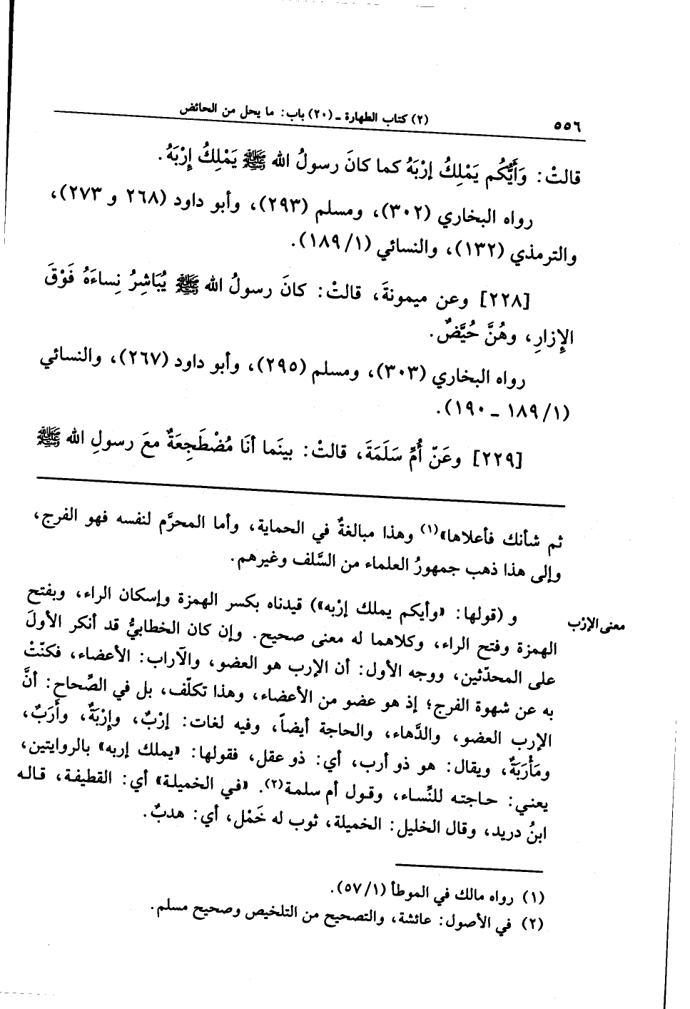 [228] وَعَن مَيمُونَةَ، قَالَت: كَانَ رَسُولُ اللهِ - صلى الله عليه وسلم - يُبَاشِرُ نِسَاءَهُ فَوقَ الإِزَارِ، وَهُنَّ حُيَّضٌ.