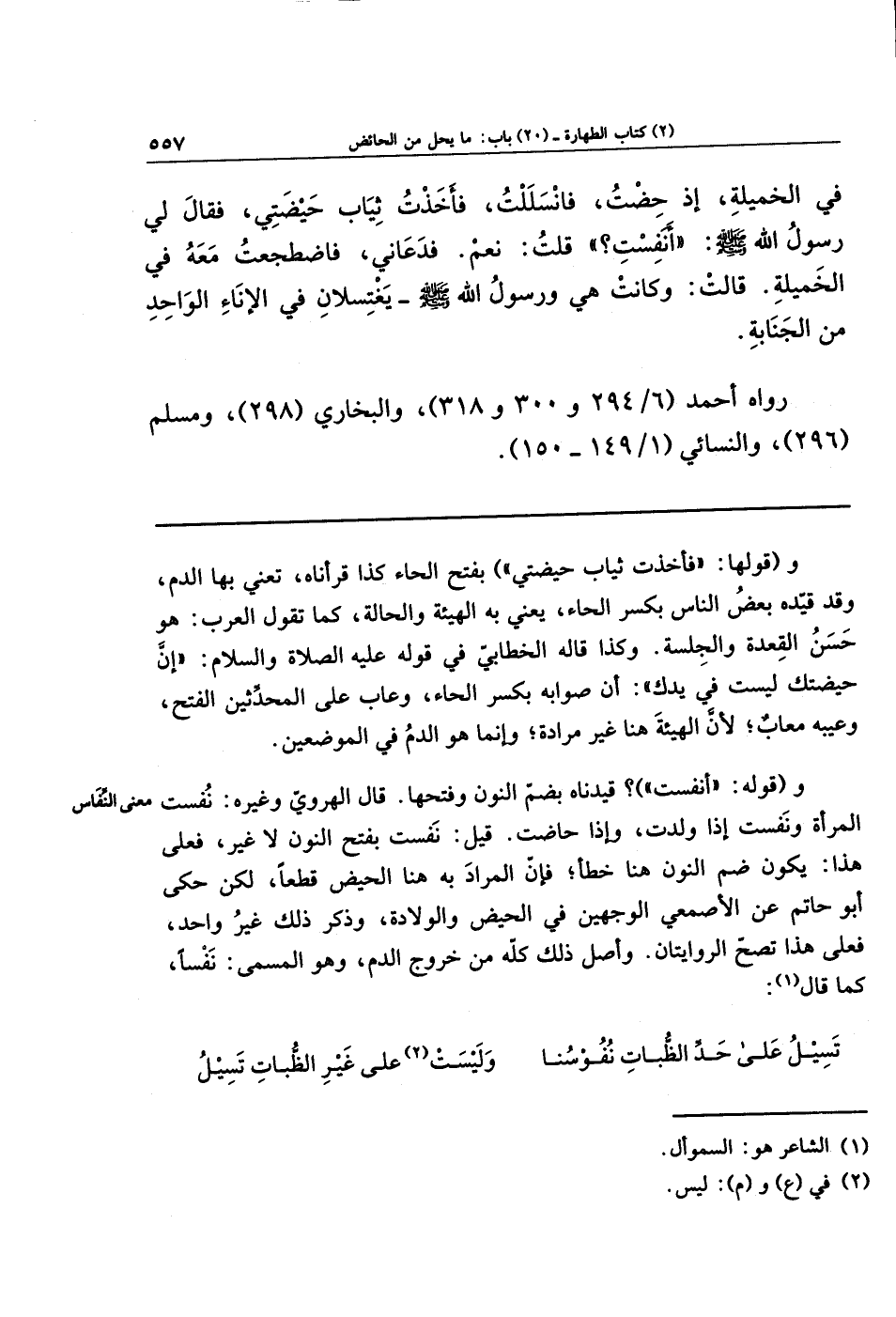 فِي الخَمِيلَةِ، إِذ حِضتُ، فَانسَلَلتُ، فَأَخَذتُ ثِيَابَ حيضَتِي، فَقَالَ لِي رَسُولُ اللهِ - صلى الله عليه وسلم -: أَنَفِستِ؟ قُلتُ: نَعَم. فَدَعَانِي، فَاضطَجَعتُ مَعَهُ فِي الخَمِيلَةِ. قَالَت: وَكَانَت هِيَ وَرَسُولُ اللهِ - صلى الله عليه وسلم - يَغتَسِلان فِي الإِنَاءِ الوَاحِدِ مِنَ الجَنَابَةِ.