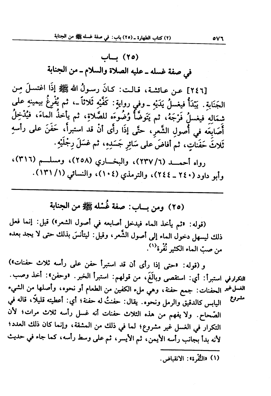[246] عَن عَائِشَةَ؛ قَالَت: كَانَ رَسُولُ اللهِ - صلى الله عليه وسلم - إِذَا اغتَسَلَ مِنَ الجَنَابَةِ. يَبدَأُ فَيَغسِلُ يَدَيهِ - وَفِي رِوَايَةٍ: كَفَّيهِ ثَلاثًا -، ثُمَّ يُفرِغُ بِيَمِينِهِ عَلَى شِمَالِهِ فَيَغسِلُ فَرجَهُ، ثُمَّ يَتَوَضَّأُ وُضُوءَهُ لِلصَّلاةِ، ثُمَّ يَأخُذُ المَاءَ، فَيُدخِلُ أَصَابِعَهُ فِي أُصُولِ الشَّعرِ، حَتَّى إِذَا رَأَى أَن قَدِ استَبرَأَ، حَفَنَ عَلَى رَأسِهِ ثَلاثَ حَفَنَاتٍ، ثُمَّ أَفَاضَ عَلَى سَائِرِ جَسَدِهِ، ثُمَّ غَسَلَ رِجلَيهِ.