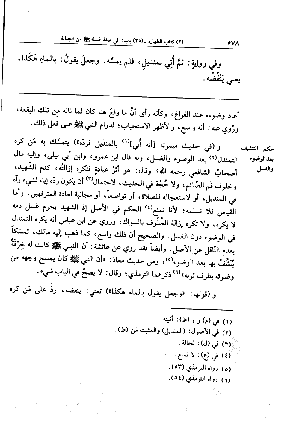 وأما القياس فلا نسلمهُ؛ لأنا نمنع (¬4) الحكم في الأصل؛ إذ الشهيد يحرم غَسل دمه، لا يكره، ولا تكره إزالة الخلوف بالسواك، وروي عن ابن عباس أنه يُكره التمندُلُ في الوضوء دون الغسل. والصحيح أن ذلك واسع، كما ذهب إليه مالك، تمسكًا بعدم الناقل عن الأصل. وأيضًا فقد روي عن عائشة: أن النبي - صلى الله عليه وسلم - كانت له خرقة ينشف بها بعد الوضوء (¬5)، ومن حديث معاذ: أن النبي - صلى الله عليه وسلم - كان يمسح وجهه من وضوئه بطرف ثوبه (¬6)، ذكرهما الترمذي، وقال: لا يصح في الباب شيء.