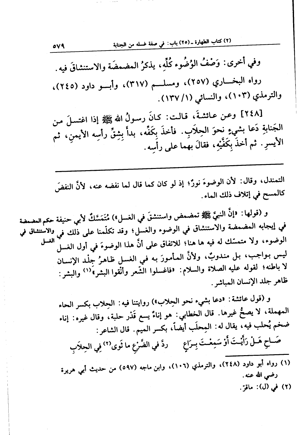 [248] وَعَن عَائِشَةَ؛ قَالَت: كَانَ رَسُولُ اللهِ - صلى الله عليه وسلم - إِذَا اغتَسَلَ مِنَ الجَنَابَةِ دَعَا بِشَيءٍ نحو الحِلابِ، فَأَخَذَ بِكَفِّهِ، بَدَأَ بِشِقِّ رَأسِهِ الأَيمَنِ، ثُمَّ الأَيسَرِ، ثُمَّ أَخَذَ بِكَفَّيهِ، فَقَالَ بِهِمَا عَلَى رَأسِهِ.