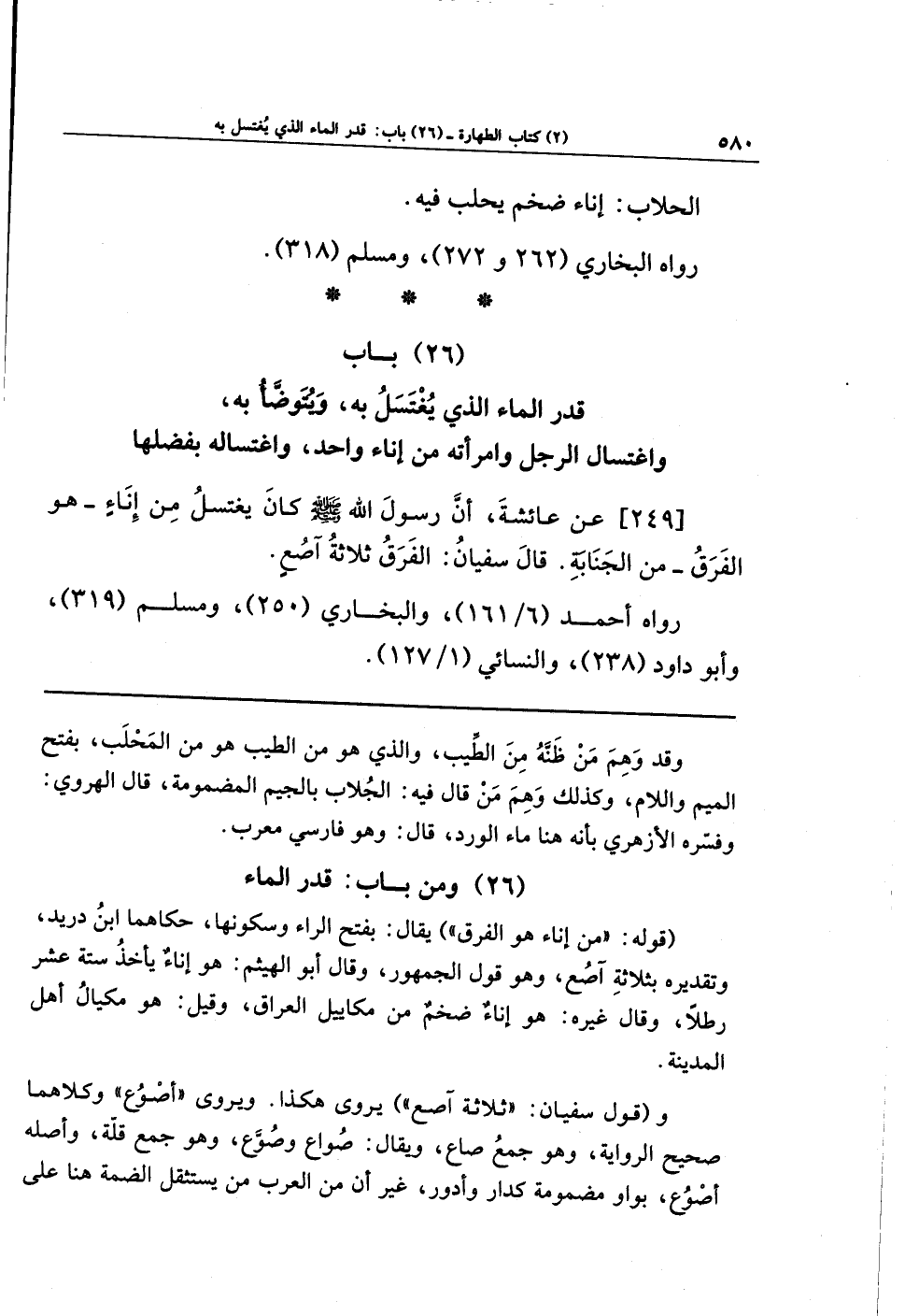(26) باب قدر الماء الذي يُغتَسَل به ويُتَوَضَّأُ به واغتسال الرجل وامرأته من إناء واحد، واغتساله بفضلها