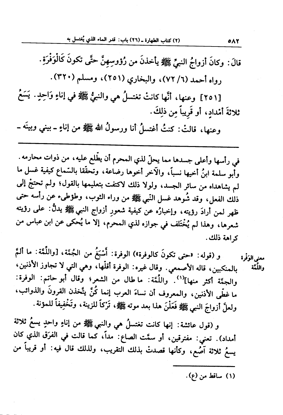 [251] وَعَنهَا؛ أَنَّهَا كَانَت تَغتَسِلُ هِيَ وَالنَّبِيُّ - صلى الله عليه وسلم - فِي إِنَاءٍ وَاحِدٍ. يَسَعُ ثَلاثَةَ أَمدَادٍ، أو قَرِيبًا مِن ذَلِكَ.