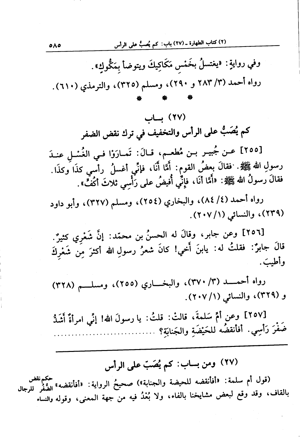 327 - [255] عَن جُبَيرِ بنِ مُطعِمٍ؛ قَالَ: تَمَارَوا فِي الغُسلِ عِندَ رَسُولِ اللهِ - صلى الله عليه وسلم -. فَقَالَ بَعضُ القَومِ: أَمَّا أَنَا، فَإِنِّي أَغسِلُ رَأسِي كَذَا وَكَذَا. فَقَالَ رَسُولُ اللهِ - صلى الله عليه وسلم -: أَمَّا أَنَا، فَإِنِّي أُفِيضُ عَلَى رَأسِي ثَلاثَ أَكُفٍّ.