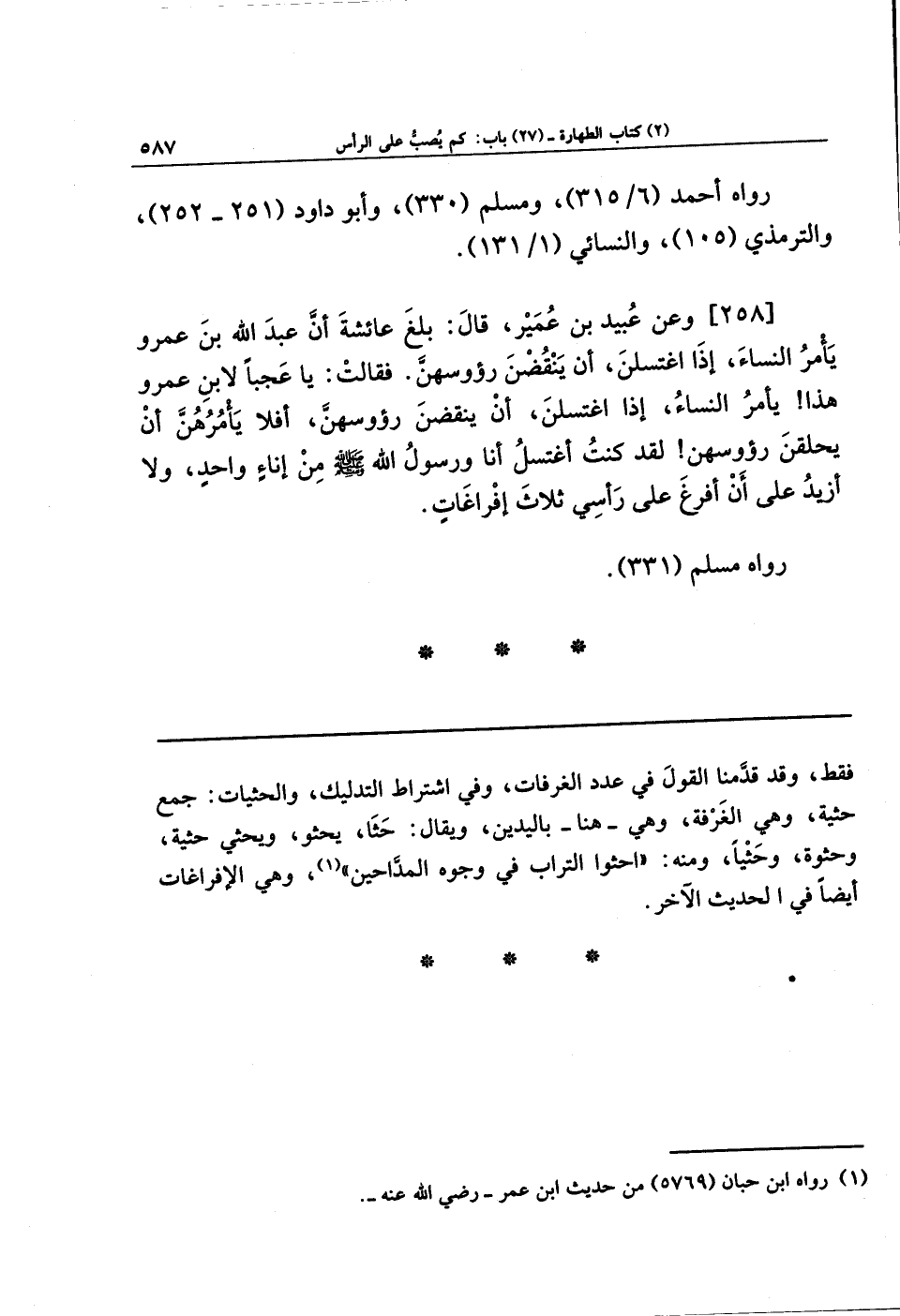 [258] وَعَن عُبَيدِ بنِ عُمَيرٍ؛ قَالَ: بَلَغَ عَائِشَةَ أَنَّ عَبدَ اللهِ بنَ عمرو يَأمُرُ النِّسَاءَ، إِذَا اغتَسَلنَ، أَن يَنقُضنَ رُؤوسَهُنَّ. فَقَالَت: يَا عَجَبًا لابنِ عمرو هَذَا! يَأمُرُ النِّسَاءَ، إِذَا اغتَسَلنَ، أَن يَنقُضنَ رُؤوسَهُنَّ، أَفَلا يَأمُرُهُنَّ أَن يَحلِقنَ رُؤوسَهُنَّ! لَقَد كُنتُ أَغتَسِلُ أَنَا وَرَسُولُ اللهِ - صلى الله عليه وسلم - مِن إِنَاءٍ وَاحِدٍ، ولا أَزِيدُ عَلَى أَن أُفرِغَ عَلَى رَأسِي ثَلاثَ إِفرَاغَاتٍ.