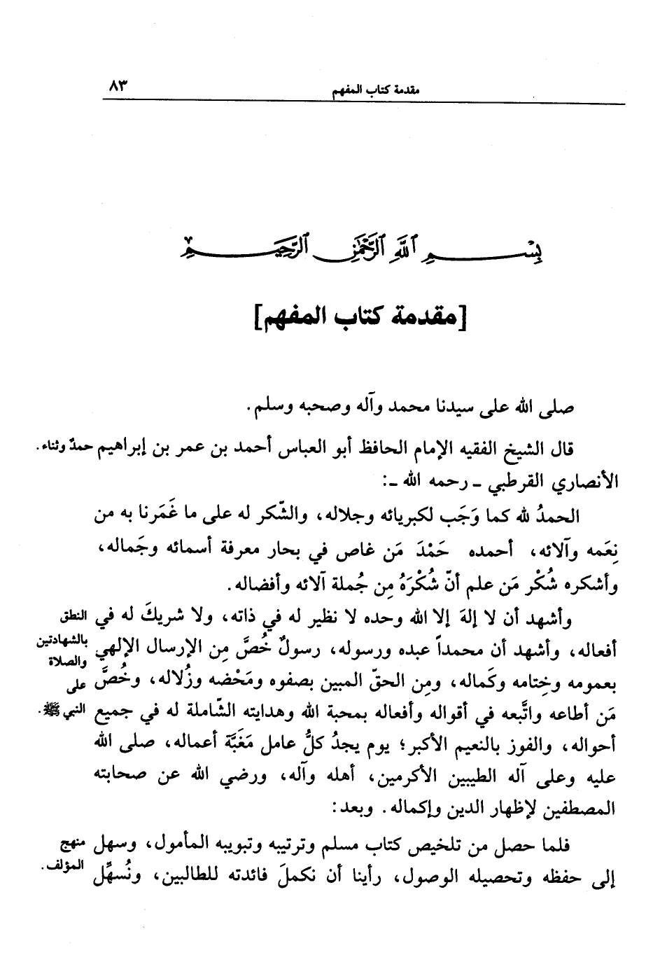 قال الشيخُ الفقيهُ الإمام الحافظ أبو العبَّاس أحمَدُ بنُ عُمَرَ بنِ إبراهيمَ، الأنصاريُّ القرطبيُّ، رحمه الله: