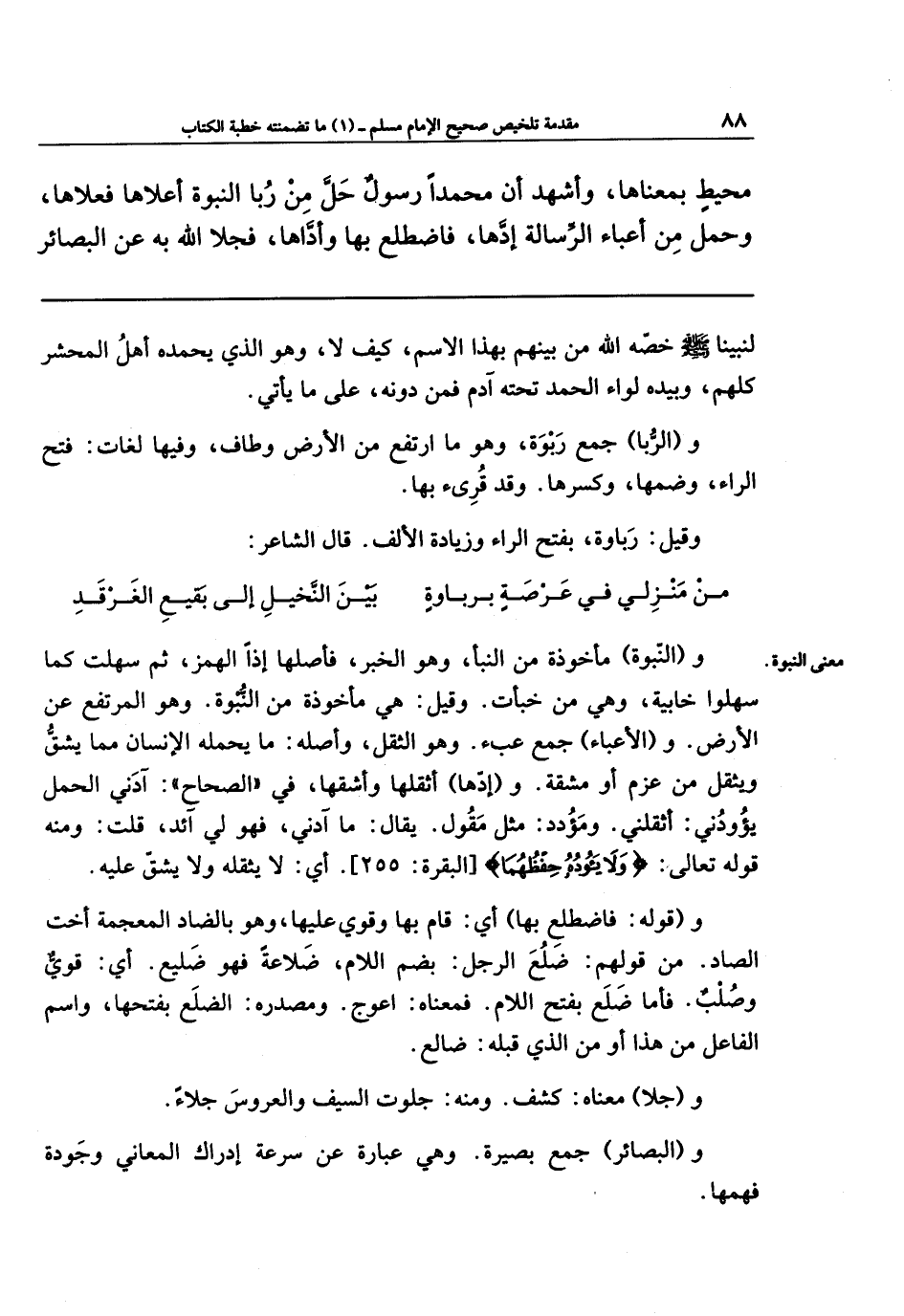 مُحيطٍ بِمَعنَاهَا، وَأَشهَدُ أنَّ محمَّدًا رَسُولٌ حَلَّ مِن رُبَا النبوَّةِ أَعلاَهَا فَعَلاَهَا، وَحَمَلَ مِن أَعبَاءِ الرِّسَالَة إِدَّهَا، فَاضطلَعَ بِهَا وَأَدَّاهَا، فجلا اللهُ بِهِ عن البصائرِ