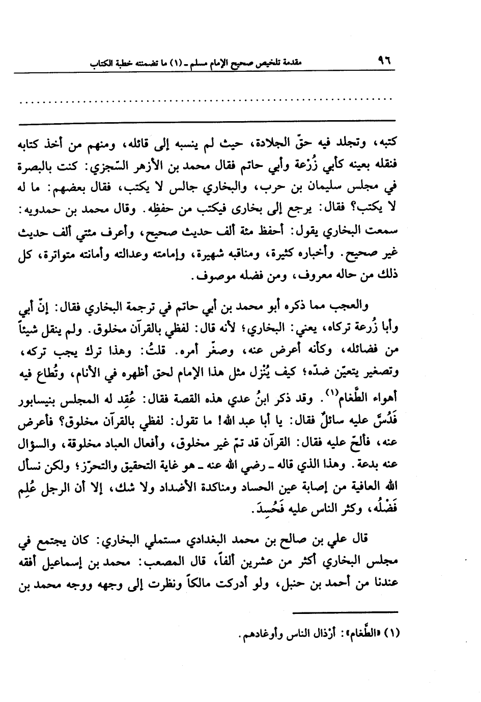 والعجبُ مما ذكره أبو محمدِ بنُ أبي حاتم في ترجمة البخاري، فقال: إنَّ أبي وأبا زرعة تركاه - يعني البخاري - لأنه قال: لفظي بالقرآن مخلوق، ولم ينقُل شيئًا من فضائله، وكأنَّه أعرَضَ عنه وصغَّرَ أمره.