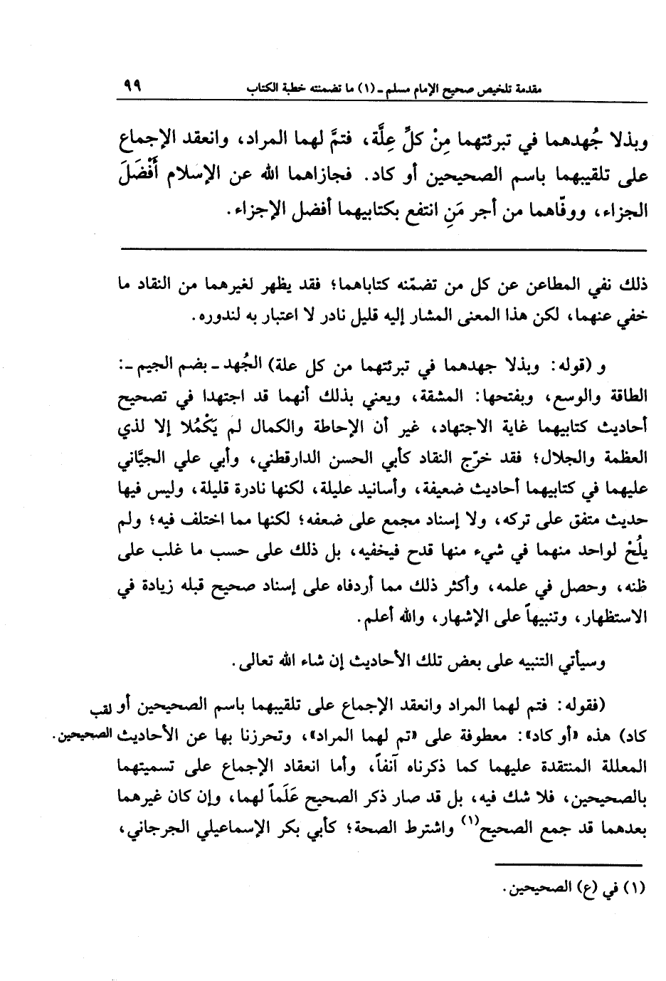 وبَذَلا جُهدَهُما في تَبرِئَتِهِما مِن كُلِّ عِلَّة، فتمَّ لهُما المُرادُ، وانعَقَدَ الإجماعُ على تَلقِيبِهِما باسمِ الصَّحيحَين أَو كاد، فجَازاهُما الله عَنِ الإسلامِ أَفضَلَ الجَزاء، وَوَفَّاهُما مِن أَجرِ مَنِ انتَفَعَ بِكِتابَيهِما أَفضَلَ الإجزَاء.