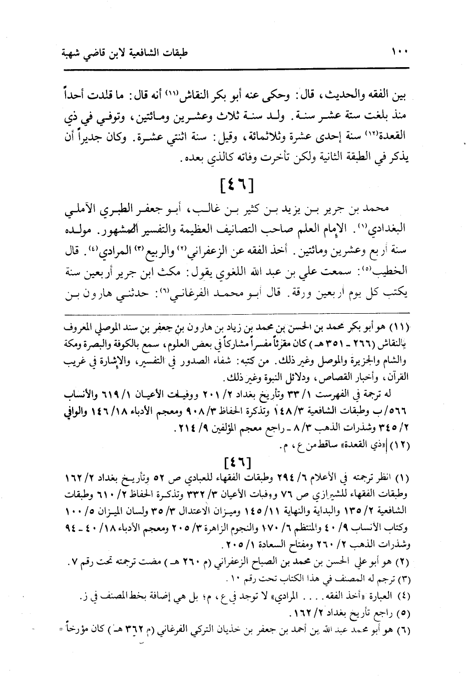 46 - مُحَمَّد بن جرير بن يزِيد بن كثير بن غَالب أَبُو جَعْفَر الطَّبَرِيّ الآملي الْبَغْدَادِيّ الإِمَام الْعلم صَاحب التصانيف الْعَظِيمَة وَالتَّفْسِير الْمَشْهُور مولده سنة أَربع وَعشْرين وَمِائَتَيْنِ أَخذ الْفِقْه عَن الزَّعْفَرَانِي وَالربيع الْمرَادِي قَالَ الْخَطِيب سَمِعت عَليّ بن عبد الله اللّغَوِيّ يَقُول مكث ابْن جرير أَرْبَعِينَ سنة يكْتب كل يَوْم أَرْبَعِينَ ورقة قَالَ أَبُو مُحَمَّد الفرغاني حَدثنِي هَارُون بن