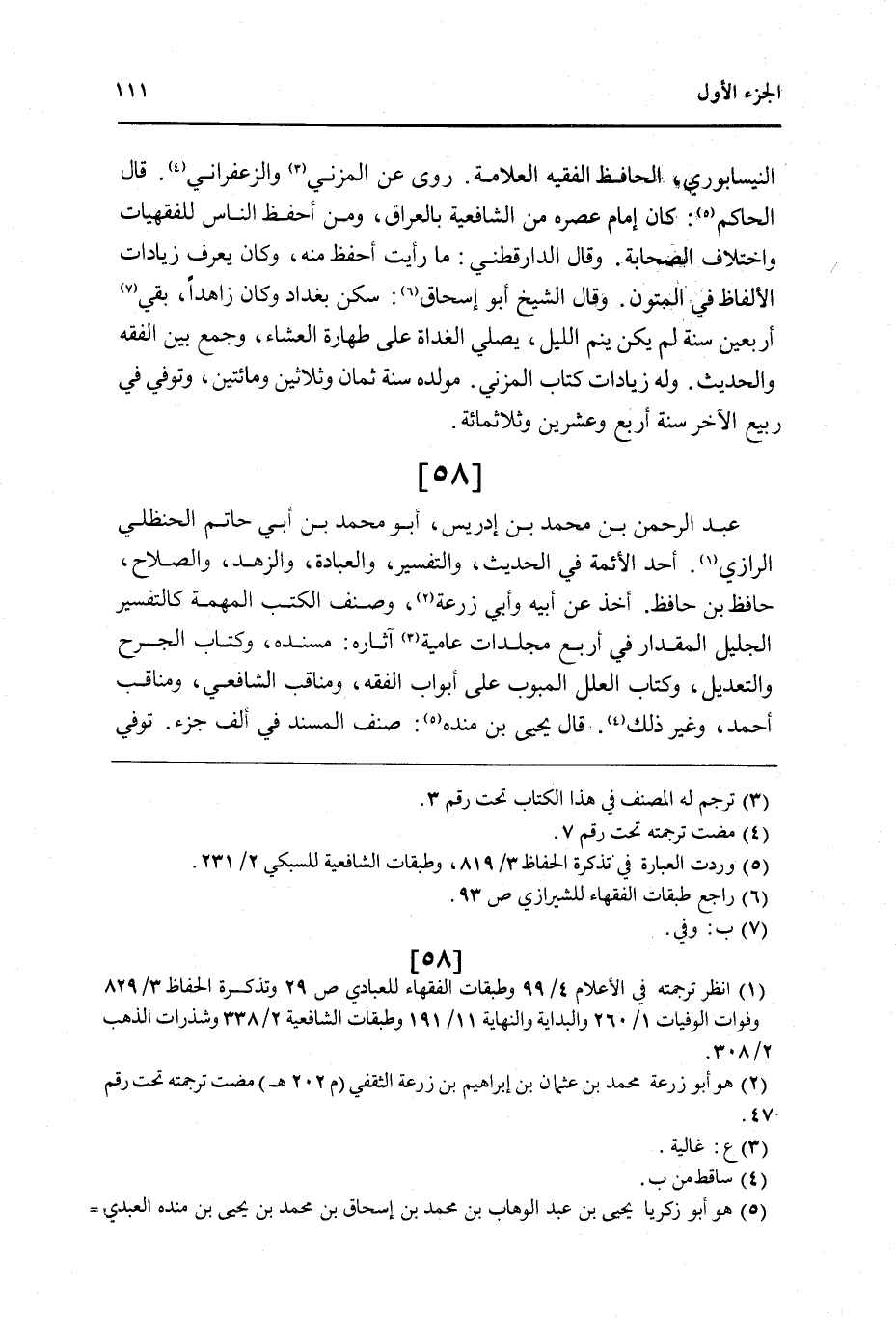 58 - عبد الرَّحْمَن بن مُحَمَّد بن إِدْرِيس أَبُو مُحَمَّد بن أبي حَاتِم الْحَنْظَلِي الرَّازِيّ أحد الْأَئِمَّة فِي الحَدِيث وَالتَّفْسِير وَالْعِبَادَة والزهد وَالصَّلَاح حَافظ بن حَافظ أَخذ عَن أَبِيه وَأبي زرْعَة وصنف الْكتب المهمة كالتفسير الْجَلِيل الْمِقْدَار فِي أَربع مجلدات عامية آثاره مُسْنده وَكتاب الْجرْح وَالتَّعْدِيل وَكتاب الْعِلَل المبوب على أَبْوَاب الْفِقْه ومناقب الشَّافِعِي ومناقب أَحْمد وَغير ذَلِك قَالَ يحيى بن مَنْدَه صنف الْمسند فِي ألف جُزْء توفّي