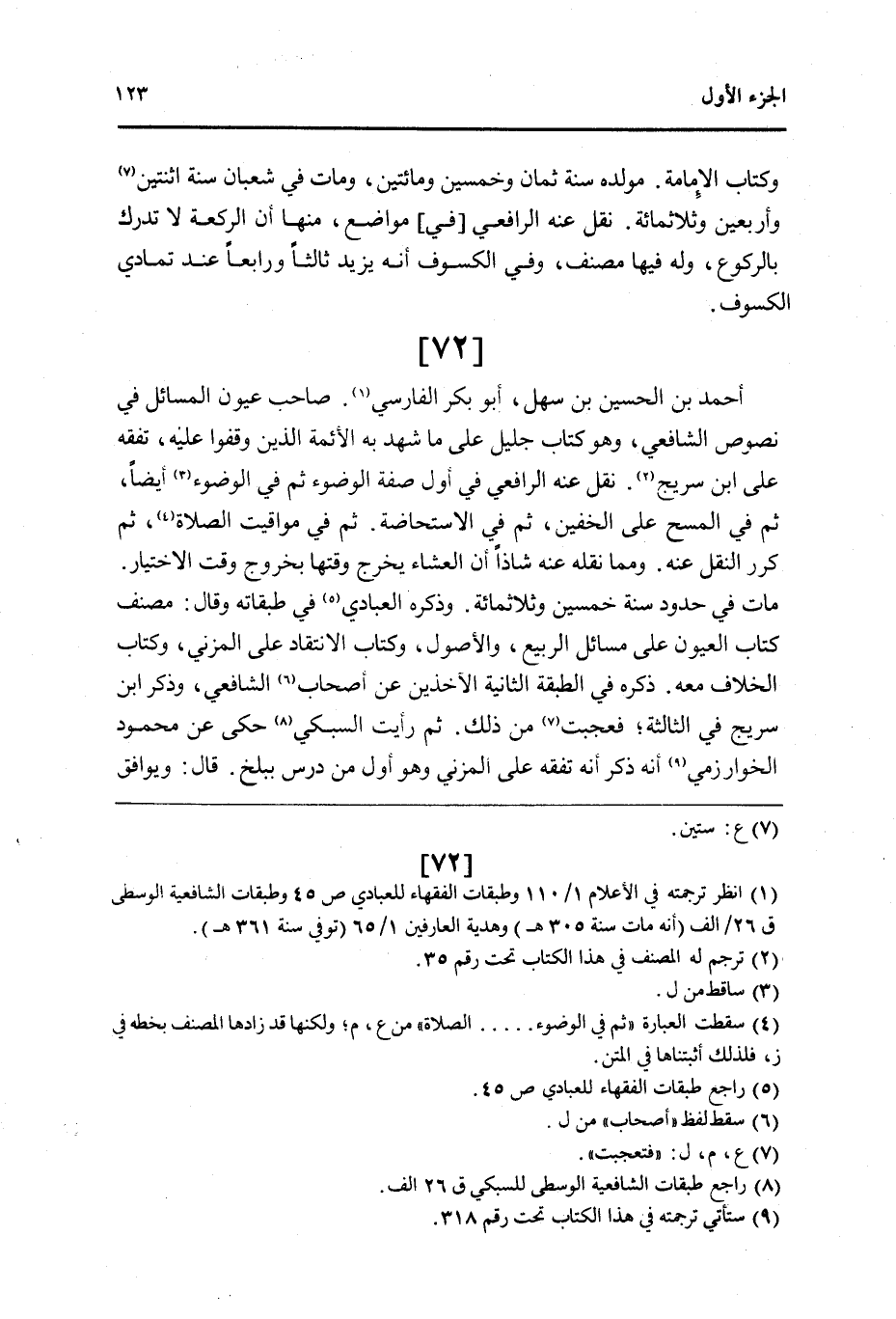 72 - أَحْمد بن الْحُسَيْن بن سهل أَبُو بكر الْفَارِسِي صَاحب عُيُون الْمسَائِل فِي نُصُوص الشَّافِعِي وَهُوَ كتاب جليل على مَا شهد بِهِ الْأَئِمَّة الَّذين وقفُوا عَلَيْهِ تفقه على ابْن سُرَيج نقل عَنهُ الرَّافِعِيّ فِي أول صفة الْوضُوء ثمَّ فِي الْوضُوء أَيْضا ثمَّ فِي الْمسْح على الْخُفَّيْنِ ثمَّ فِي الِاسْتِحَاضَة ثمَّ فِي مَوَاقِيت الصَّلَاة ثمَّ كرر النَّقْل عَنهُ وَمِمَّا نَقله عَنهُ شاذا أَن الْعشَاء يخرج وَقتهَا بِخُرُوج وَقت الِاخْتِيَار مَاتَ فِي حُدُود سنة خمسين وثلاثمائة وَذكره الْعَبَّادِيّ فِي طبقاته وَقَالَ مُصَنف كتاب الْعُيُون على مسَائِل الرّبيع وَالْأُصُول وَكتاب الانتقاد على الْمُزنِيّ وَكتاب الْخلاف مَعَه ذكره فِي الطَّبَقَة الثَّانِيَة الآخذين عَن أَصْحَاب الشَّافِعِي وَذكر ابْن سُرَيج فِي الثَّالِثَة فعجبت من ذَلِك ثمَّ رَأَيْت السُّبْكِيّ حكى عَن مَحْمُود الْخَوَارِزْمِيّ انه ذكر انه تفقه على الْمُزنِيّ وَهُوَ أول من درس ببلخ قَالَ ويوافق