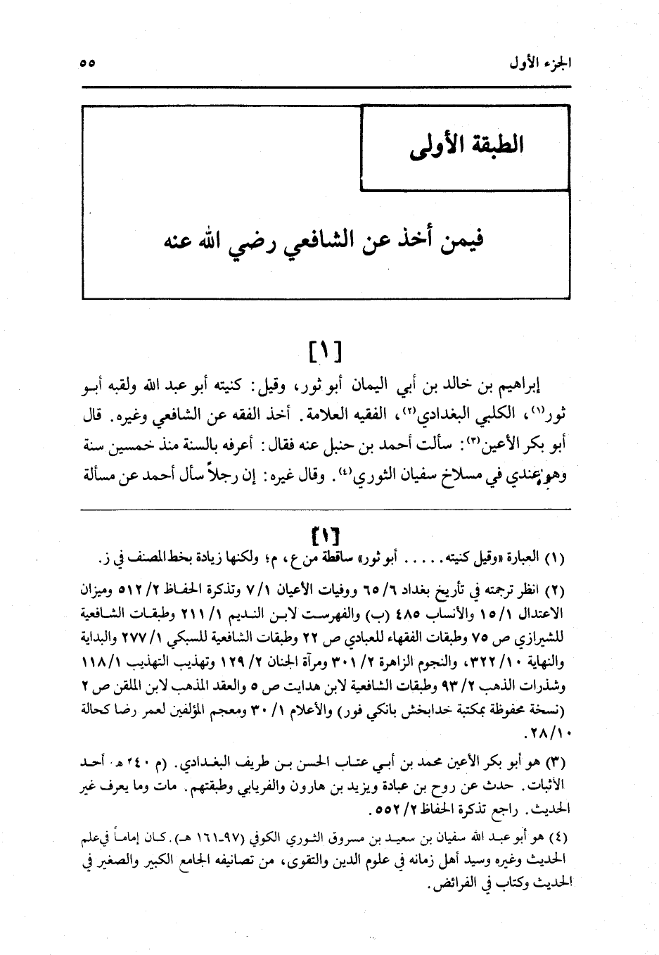 - إِبْرَاهِيم بن خَالِد بن أبي الْيَمَان أَبُو ثَوْر وَقيل كنيته أَبُو عبد الله ولقبه أَبُو ثَوْر الْكَلْبِيّ الْبَغْدَادِيّ الْفَقِيه الْعَلامَة أَخذ الْفِقْه عَن الشَّافِعِي وَغَيره قَالَ أَبُو بكر الْأَعْين سَأَلت أَحْمد بن حَنْبَل عَنهُ فَقَالَ اعرفه بِالسنةِ مُنْذُ خمسين سنة وَهُوَ عِنْدِي فِي مسلاخ سُفْيَان الثَّوْريّ وَقَالَ غَيره إِن رجلا سَأَلَ أَحْمد عَن مَسْأَلَة