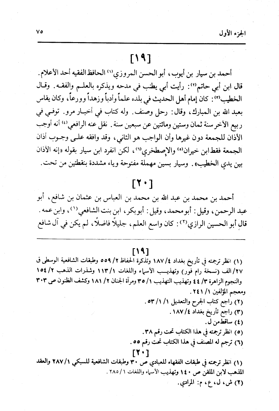 19 - أَحْمد بن سيار بن أَيُّوب أَبُو الْحسن الْمروزِي الْحَافِظ الْفَقِيه أحد الْأَعْلَام قَالَ ابْن أبي حَاتِم رَأَيْت أبي يطنب فِي مدحه ويذكره بِالْعلمِ وَالْفِقْه وَقَالَ الْخَطِيب كَانَ إِمَام أهل الحَدِيث فِي بَلَده علما وأدبا وزهدا وورعا وَكَانَ يُقَاس بِعَبْد الله بن الْمُبَارك وَقَالَ رَحل وصنف وَله كتاب فِي أَخْبَار مرو توفّي فِي ربيع الآخر سنة ثَمَان وَسِتِّينَ وَمِائَتَيْنِ عَن سبعين سنة نقل عَنهُ الرَّافِعِيّ انه أوجب الْأَذَان للْجُمُعَة دون غَيرهَا وَأَن الْوَاجِب هُوَ الثَّانِي وَقد وَافقه على وجوب أَذَان الْجُمُعَة فَقَط ابْن خيران والإصطخري لَكِن انْفَرد ابْن سيار بقوله انه الْأَذَان بَين يَدي الْخَطِيب وسيارة بسين مُهْملَة مَفْتُوحَة وياء مشدودة بنقطتين من تَحت