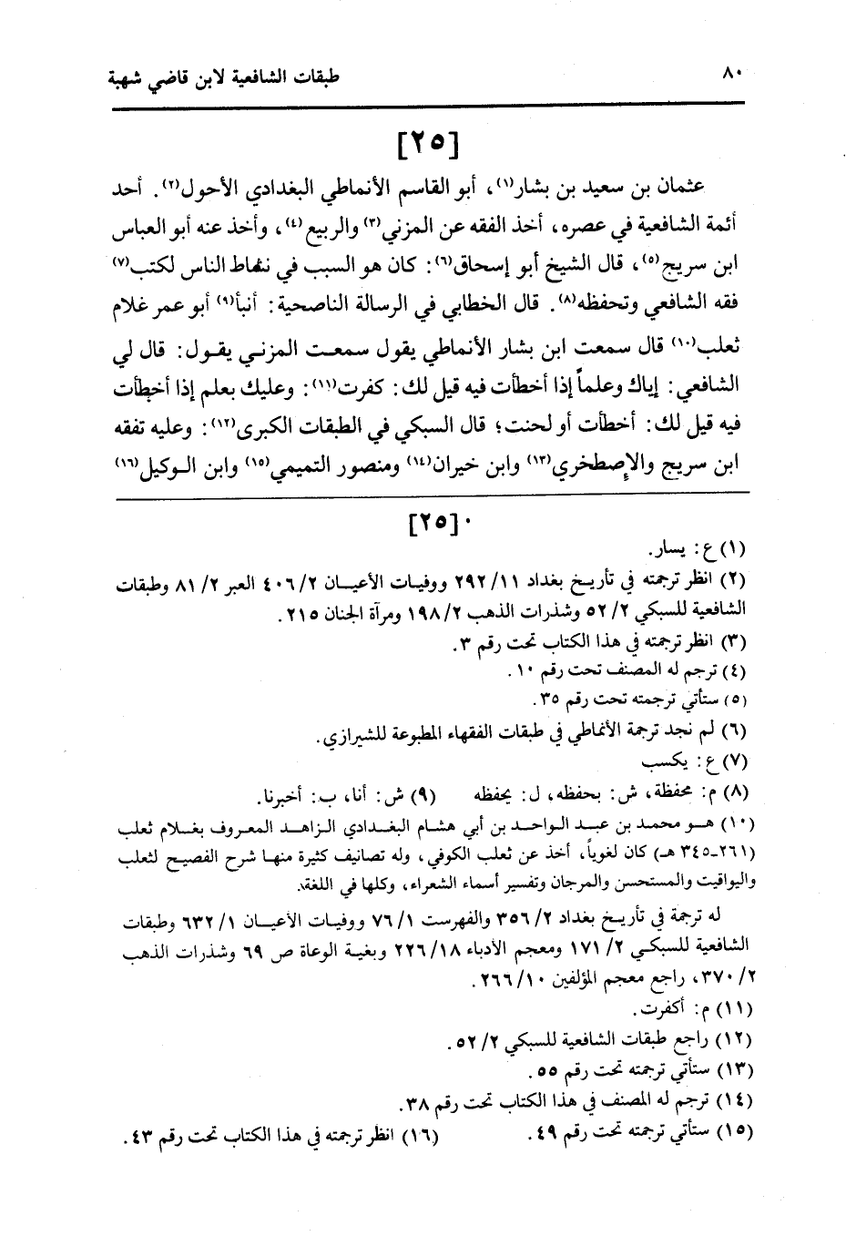 25 - عُثْمَان بن سعيد بن بشار أَبُو الْقَاسِم الْأنمَاطِي الْبَغْدَادِيّ الْأَحول أحد أَئِمَّة الشَّافِعِيَّة فِي عصره أَخذ الْفِقْه عَن الْمُزنِيّ وَالربيع وَأخذ عَنهُ أَبُو الْعَبَّاس ابْن سُرَيج قَالَ الشَّيْخ ابو إِسْحَاق كَانَ هُوَ السَّبَب فِي نشاط النَّاس لكتب فقه الشَّافِعِي وَتَحفظه قَالَ الْخطابِيّ فِي الرسَالَة الناصحية أنبا أَبُو عمر غُلَام ثَعْلَب قَالَ سَمِعت ابْن بشار الْأنمَاطِي يَقُول سَمِعت الْمُزنِيّ يَقُول قَالَ لي الشَّافِعِي إياك وعلما إِذا أَخْطَأت فِيهِ قيل لَك كفرت وَعَلَيْك بِعلم إِذا أَخْطَأت فِيهِ قيل لَك أَخْطَأت أَو لحنت قَالَ السُّبْكِيّ فِي الطَّبَقَات الْكُبْرَى وَعَلِيهِ تفقه ابْن سُرَيج والإصطخري وَابْن خيران وَمَنْصُور التَّمِيمِي وَابْن الْوَكِيل