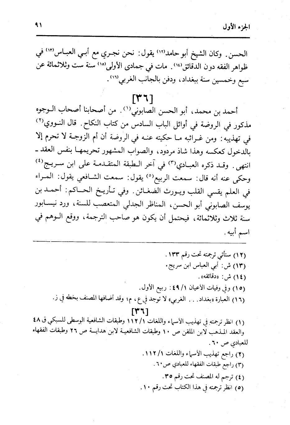 36 - أَحْمد بن مُحَمَّد أَبُو الْحسن الصَّابُونِي من أَصْحَابنَا أَصْحَاب الْوُجُوه مَذْكُور فِي الرَّوْضَة فِي أَوَائِل الْبَاب السَّادِس من كتاب النِّكَاح قَالَ النَّوَوِيّ فِي تهذيبه وَمن غَرَائِبه مَا حكيته عَنهُ فِي الرَّوْضَة أَن أم الزَّوْجَة لَا تحرم إِلَّا بِالدُّخُولِ كَعَكْسِهِ وَهَذَا شَاذ مَرْدُود وَالصَّوَاب الْمَشْهُور تَحْرِيمهَا بِنَفس العقد انْتهى وَقد ذكره الْعَبَّادِيّ فِي آخر الطَّبَقَة الْمُتَقَدّمَة على ابْن سُرَيج وَحكى عَنهُ انه قَالَ سَمِعت الرّبيع يَقُول سَمِعت الشَّافِعِي يَقُول المراء فِي الْعلم يقسي الْقلب وَيُورث الضغائن وَفِي تأريخ الْحَاكِم أَحْمد بن يُوسُف الصَّابُونِي أَبُو الْحسن المناظر الجدلي المتعصب للسّنة ورد نيسابور سنة ثَلَاث وثلاثمائة فَيحْتَمل أَن يكون هُوَ صَاحب التَّرْجَمَة وَوَقع الْوَهم فِي اسْم أَبِيه