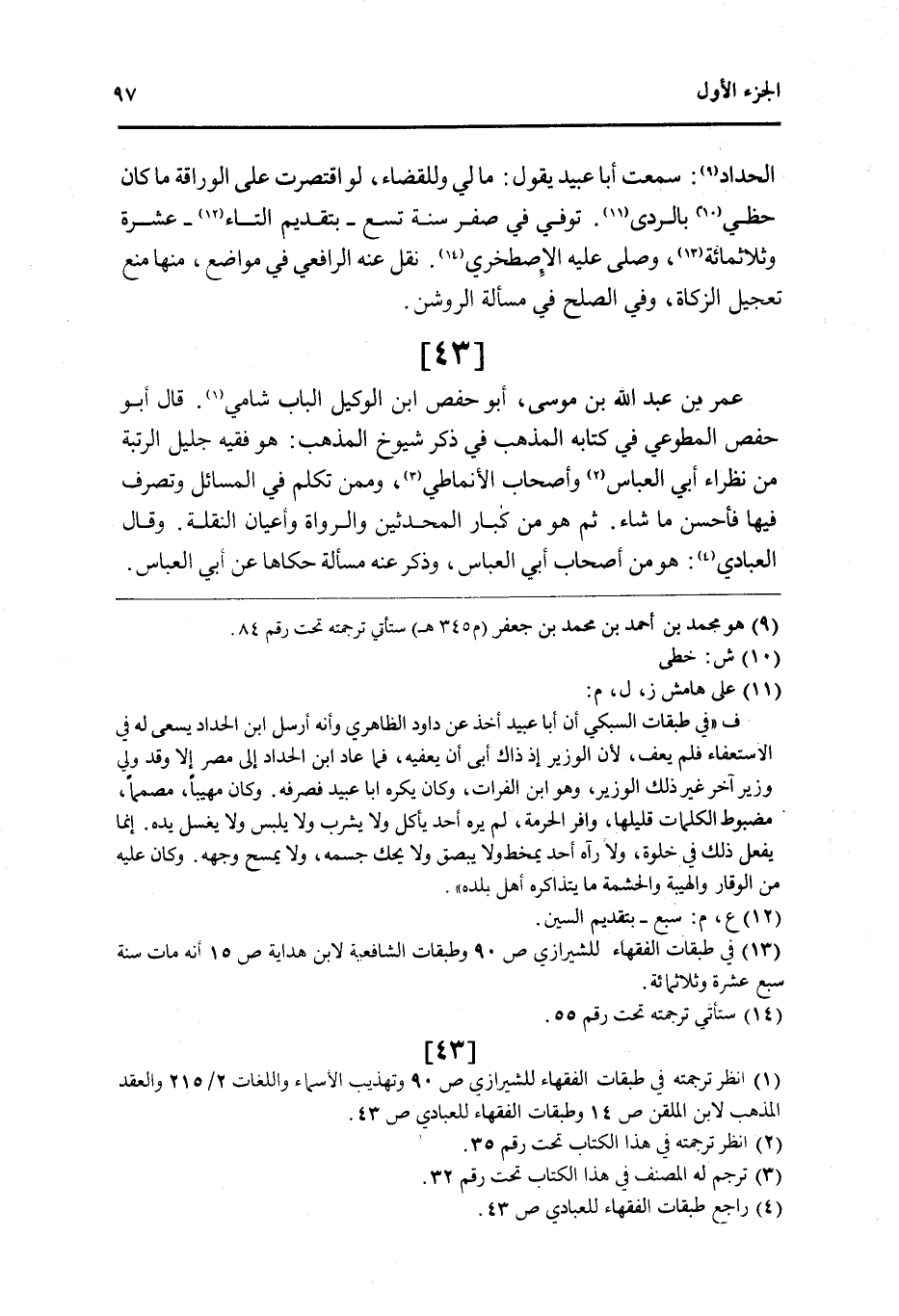 43 - عمر بن عبد الله بن مُوسَى أَبُو حَفْص ابْن الْوَكِيل الْبَاب شَامي قَالَ أَبُو حَفْص المطوعي فِي كِتَابه الْمَذْهَب فِي ذكر شُيُوخ الْمَذْهَب هُوَ فَقِيه جليل الرُّتْبَة من نظراء أبي الْعَبَّاس وَأَصْحَاب الْأنمَاطِي وَمِمَّنْ تكلم فِي الْمسَائِل وَتصرف فِيهَا فَأحْسن مَا شَاءَ ثمَّ هُوَ من كبار الْمُحدثين والرواة وأعيان النقلَة وَقَالَ الْعَبَّادِيّ هُوَ من أَصْحَاب أبي الْعَبَّاس وَذكر عَنهُ مَسْأَلَة حَكَاهَا عَن أبي الْعَبَّاس