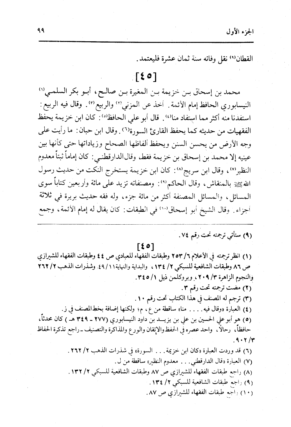 45 - مُحَمَّد بن إِسْحَاق بن خُزَيْمَة بن الْمُغيرَة بن صَالح أَبُو بكر السّلمِيّ النَّيْسَابُورِي الْحَافِظ إِمَام الْأَئِمَّة أَخذ عَن الْمُزنِيّ وَالربيع وَقَالَ فِيهِ الرّبيع استفدنا مِنْهُ أَكثر مِمَّا اسْتَفَادَ منا قَالَ أَبُو عَليّ الْحَافِظ كَانَ ابْن خُزَيْمَة يحفظ الفقهيات من حَدِيثه كَمَا يحفظ الْقَارئ السُّورَة وَقَالَ ابْن حبَان مَا رَأَيْت على وَجه الأَرْض من يحسن السّنَن ويحفظ ألفاظها الصِّحَاح وزياداتها حَتَّى كَأَنَّهَا بَين عَيْنَيْهِ إِلَّا مُحَمَّد بن إِسْحَاق بن خُزَيْمَة فَقَط وَقَالَ الدَّارَقُطْنِيّ كَانَ إِمَامًا ثبتا مَعْدُوم النظير وَقَالَ ابْن سُرَيج كَانَ ابْن خُزَيْمَة يسْتَخْرج النكت من حَدِيث رَسُول الله صلى الله عَلَيْهِ وَسلم بالمنقاش وَقَالَ الْحَاكِم ومصنفاته تزيد على مائَة وَأَرْبَعين كتابا سوى الْمسَائِل والمسائل المصنفة أَكثر من مائَة جُزْء وَله فقه حَدِيث بَرِيرَة فِي ثَلَاثَة أَجزَاء وَقَالَ الشَّيْخ أَبُو إِسْحَاق فِي الطَّبَقَات كَانَ يُقَال لَهُ إِمَام الْأَئِمَّة وَجمع