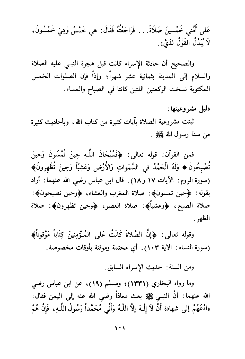 فمن القرآن: قوله تعالى: {فسبحان الله حين تمسون وحين تصبحون*وله الحمد في السموات والأرض وعشياً وحين تظهرون} [الروم: 17و18]. قال ابن عباس رضي الله عنهما: أراد بقوله: {حين تمسون}: صلاة المغرب والعشاء، {وحين تصبحون}: صلاة الصبح، {وعشياً}: صلاة العصر، {وحين تظهرون} صلاة الظهر.