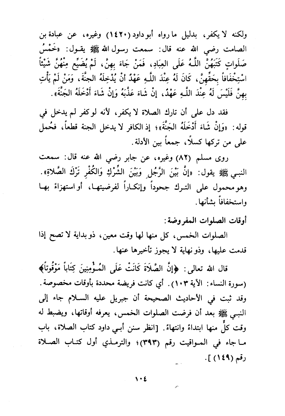روى مسلم (82) وغيره، عن جابر - رضي الله عنه - قال: سمعت النبي - صلى الله عليه وسلم - يقول: "إن بين الرجل وبين الشرك والكفر ترك الصلاة". وهو محمول على الترك جحوداً وإنكاراً لفريضتها، أو استهزاء بها واستخفافاً بشأنها.