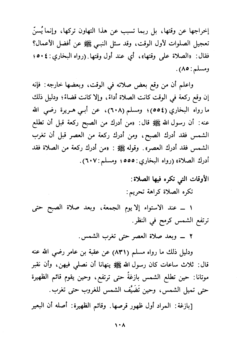 إخراجها عن وقتها، بل ربما تسبب عن هذا التهاون تركها، وإنما يسن تعجيل الصلوات لأول الوقت، وقد سأل النبي - صلى الله عليه وسلم - عن أفضل الأعمال؟ فقال: "الصلاة على وقتها"، أي عند أول وقتها. " (رواه البخاري: 504، ومسلم: 85)