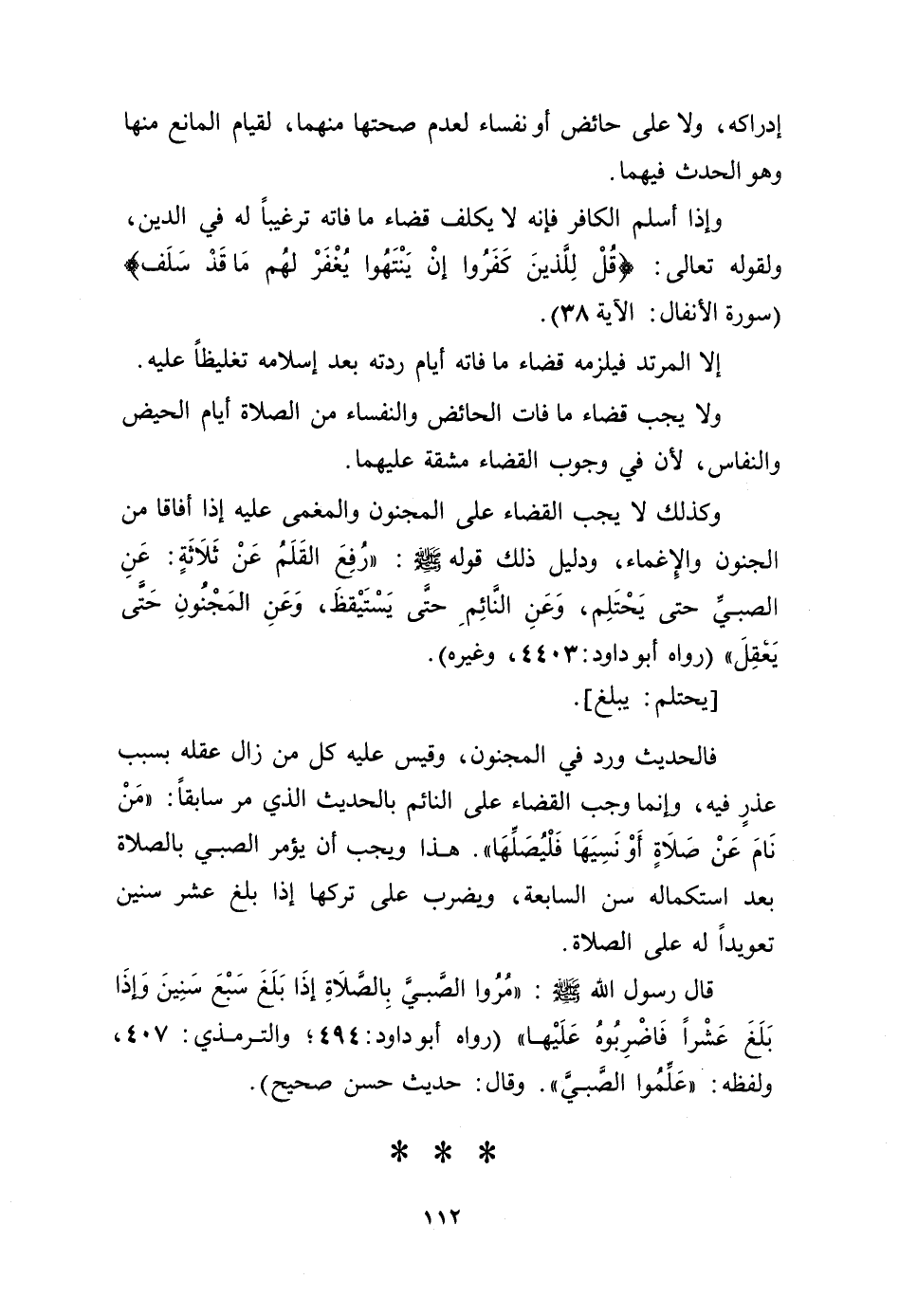 وكذلك لا يجب القضاء على المجنون والمغمى عليه إذا أفاقا من الجنون والإغماء، ودليل ذلك قوله - صلى الله عليه وسلم -: "رفع القلم عن ثلاثة: عن الصبي حتى يحتلم وعن النائم حتى يستيقظ، وعن المجنون حتى يعقل" (رواه أبو داود: 4403، وغيره). [يحتلم: يبلغ].