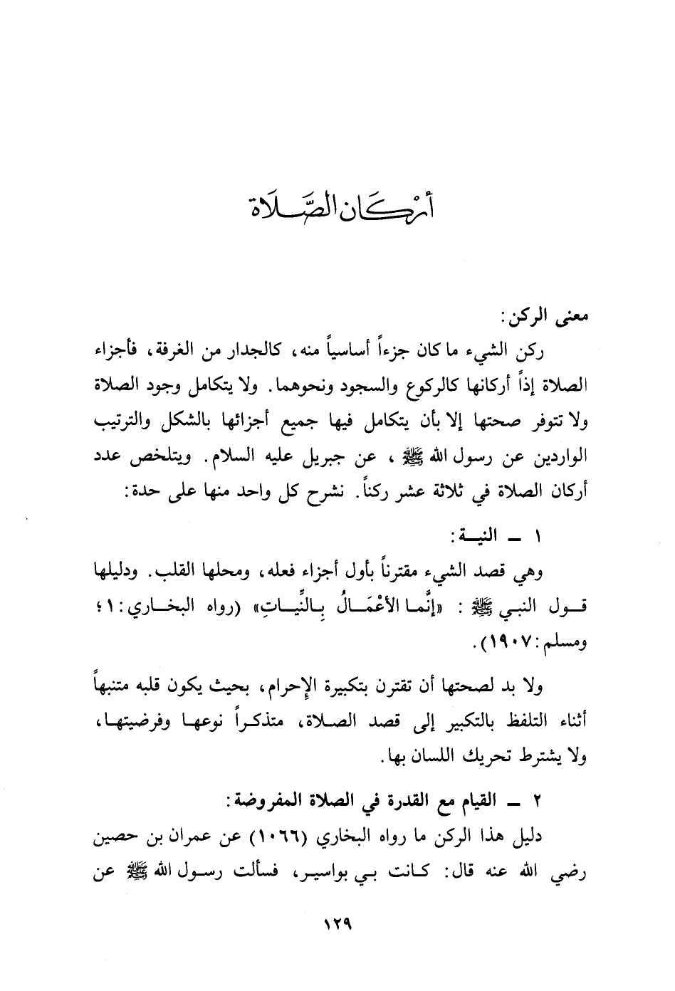 ركن الشيء ما كان جزءاً أساسياً منه، كالجدار من الغرفة، فأجزاء الصلاة إذا أركانها كالركوع والسجود ونحوهما. ولا يتكامل وجود الصلاة ولا تتوفر صحتها إلا بأن يتكامل فيها جميع أجزائها بالشكل والترتيب الواردين عن رسول الله - صلى الله عليه وسلم -، عن جبريل عليه السلام. ويتلخص عدد أركان الصلاة في ثلاثة عشر ركناً. نشرح كل واحد منها على حدة: