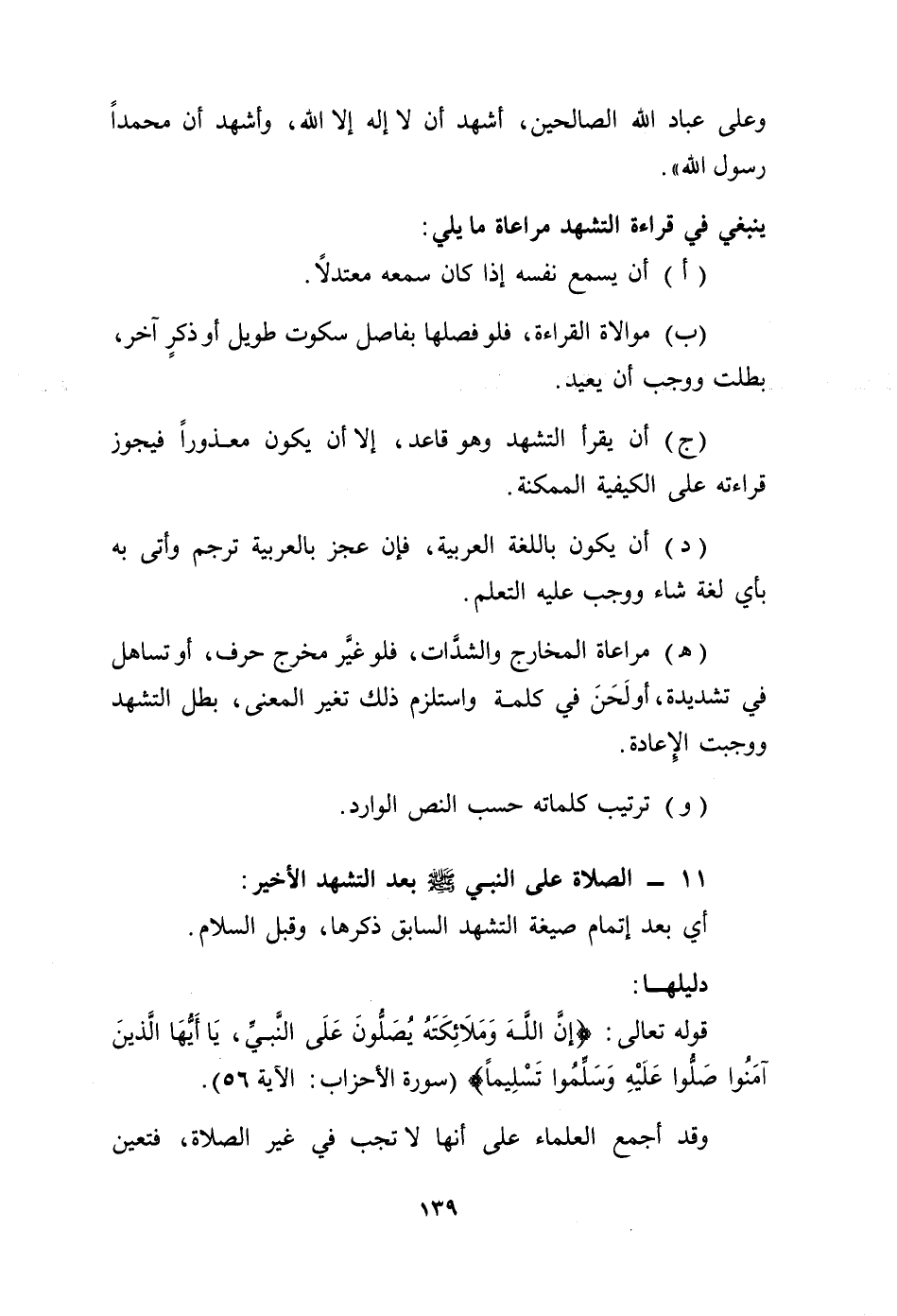 (هـ) مراعاة المخارج والشدَّات، فلو غيّر مخرج حرف، أو تساهل في تشديدة، أو لحن في كلمة واستلزم ذلك تغير المعنى، بطل التشهد ووجبت الإعادة.