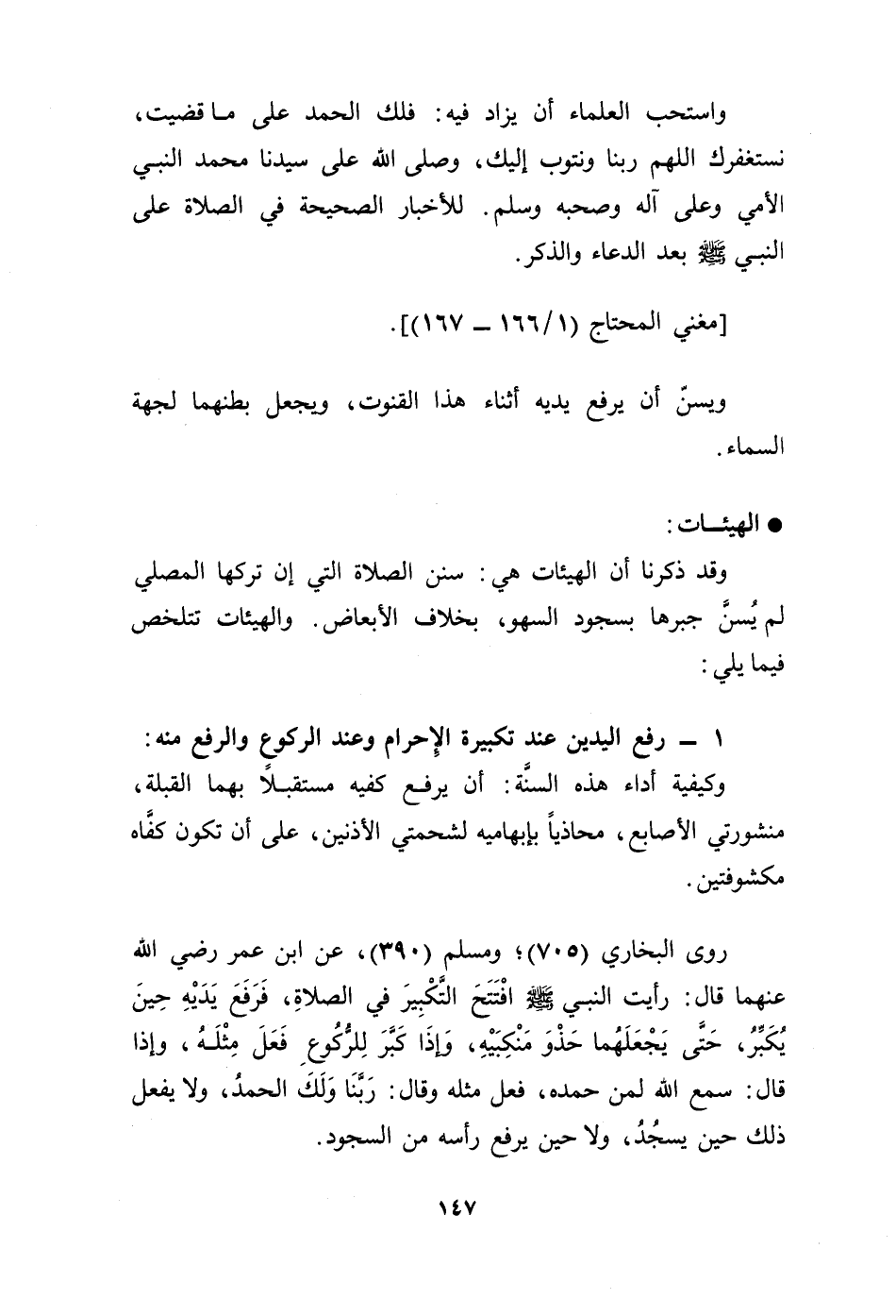 1 - رفع اليدين عند تكبيرة الإحرام وعند الركوع والرفع منه: وكيفية أداء هذه السنَّة: أن يرفع كفيه مستقبلاً بهما القبلة، منشورتي الأصابع، محاذياً بإبهاميه لشحمتي الأذنين، على أن تكون كفَّاه مكشوفتين.