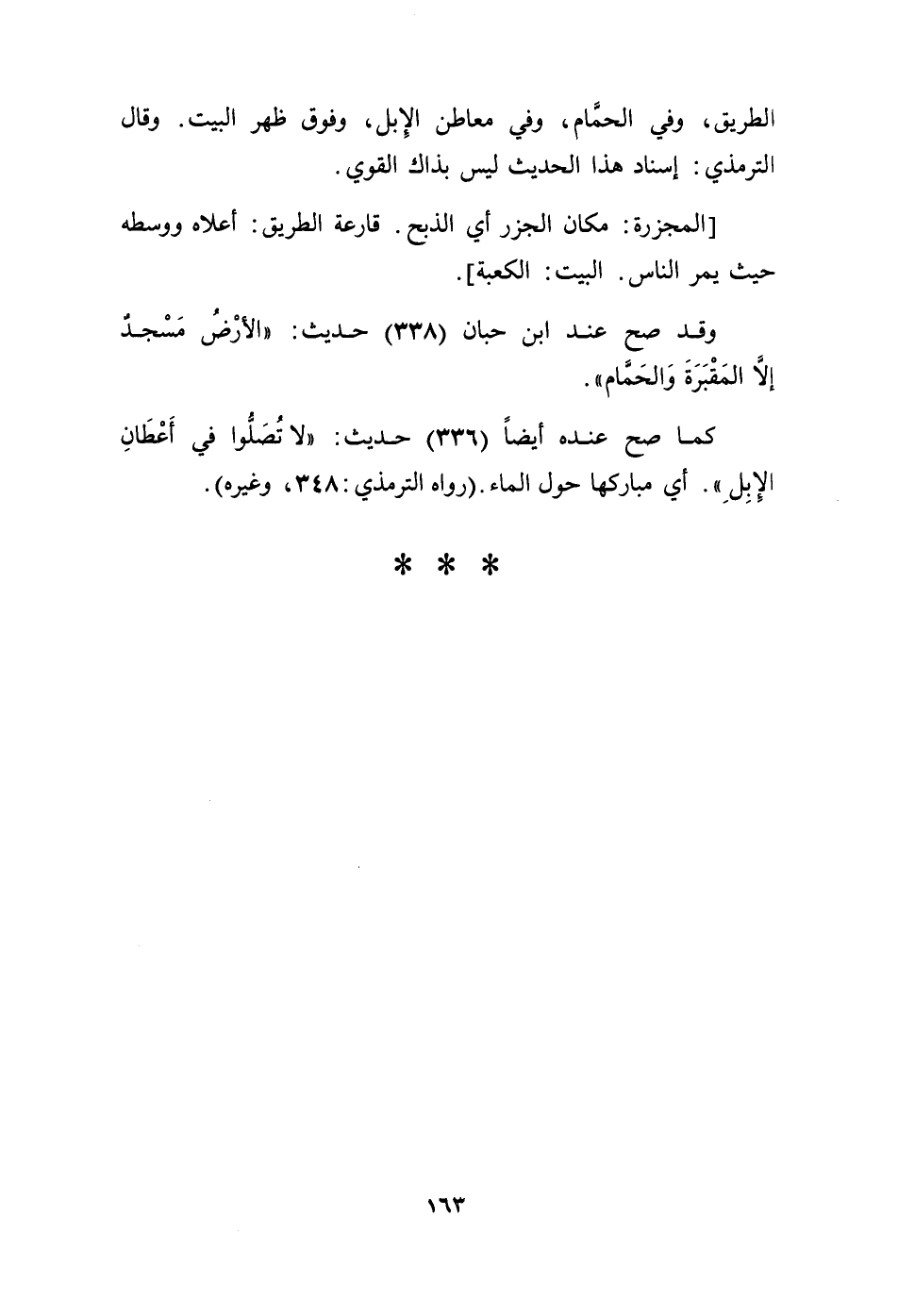 كما صح عنده أيضاً (336) حديث: "لا تصلوا في أعْطان الإبل". أي مباركها حول الماء. (رواه الترمذي: 348، وغيره).