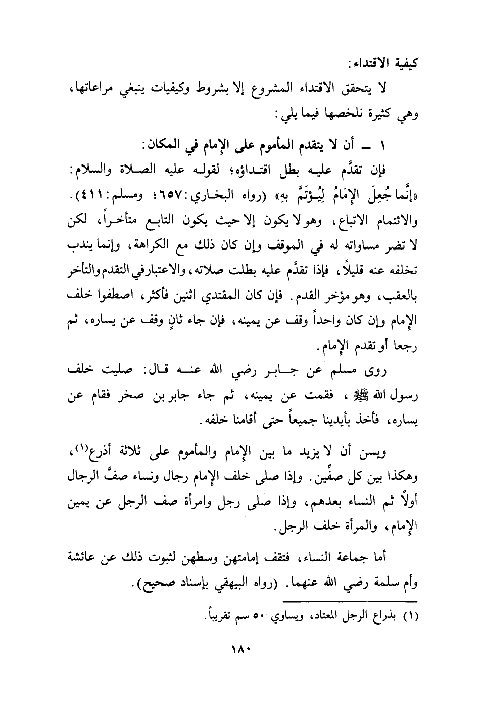 والائتمام الاتباع، وهو لا يكون إلا حيث يكون التابع متأخراً، لكن لا تضر مساواته له في الموقف وإن كان ذلك مع الكراهة، وإنما يندب تخلفه عنه قليلاً، فإذا تقدم عليه بطلت صلاته، والاعتبار في التقدم والتأخر بالعقب، وهو مؤخر القدم. فإن كان المقتدي اثنين فأكثر، اصطفوا خلف الإمام وإن كان واحداً وقف عن يمينه، فإذا جاء ثانٍ وقف عن يساره، ثم رجعا أو تقدم الإمام.
