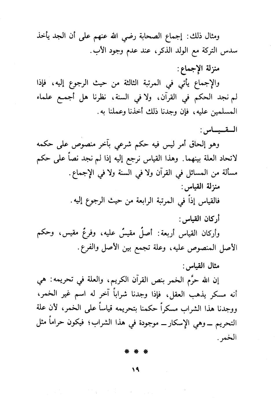 إن الله حرَّم الخمر بنص القرآن الكريم، والعلة في تحريمه: هي أنه مسكر يذهب العقل، فإذا وجدنا شراباً آخر له اسم غير الخمر، ووجدنا هذا الشراب مسكراً حكمنا بتحريمه قياساً على الخمر، لأن علة التحريم- وهي الإسكار - موجودة في هذا الشراب، فيكون حراماً مثل الخمر.