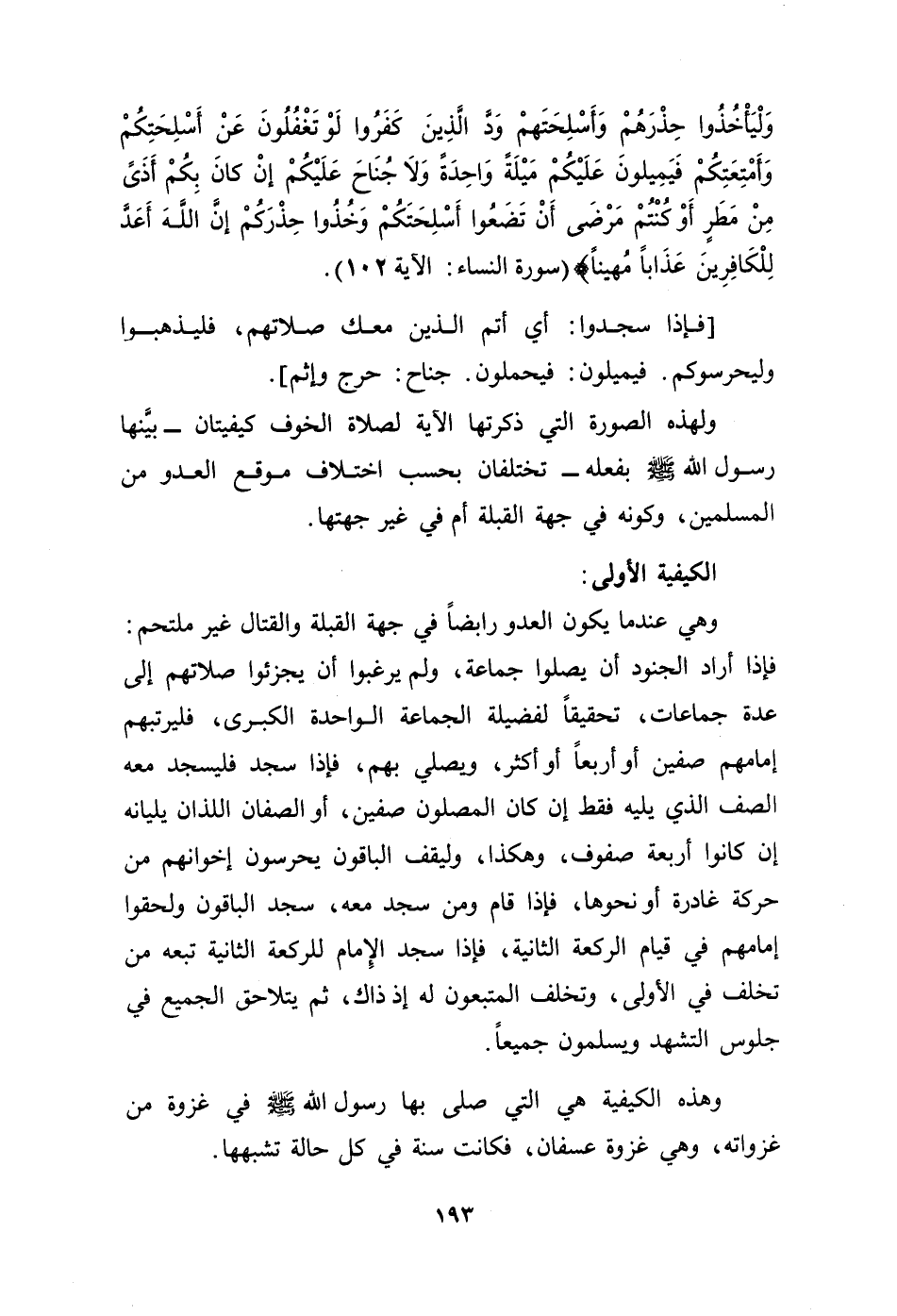 وهذه الكيفية هي التي صلى بها رسول الله - صلى الله عليه وسلم - في غزوة من غزواته، وهي عزوة عسفان، فكانت سنة في كل حالة تشبهها.