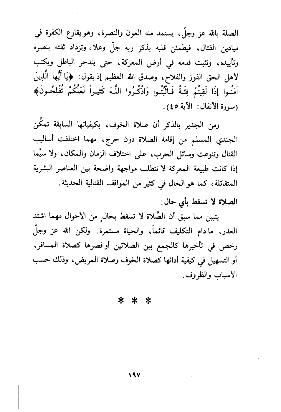ومن الجدير بالذكر أن صلاة الخوف، بكيفياتها السابقة تمكن الجندي المسلم من أقامة الصلاة دون حرج، مهما اختلفت أساليب القتال وتنوعت وسائل الحرب، على اختلاف الزمان والمكان، ولا سيما المتقاتلة، كما هو الحال في كثير من المواقف القتالية الحديثة.
