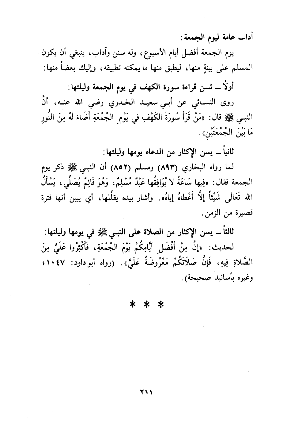 ثالثاً: يسن الإكثار من الصلاة على النبي - صلى الله عليه وسلم - في يومها وليلتها: لحديث: "إن من أفضل أيامكم يوم الجمعة، فأكثروا علي من الصلاة فيه، فإن صلاتكم معروضة علي". (رواه أبو داود: 1047؛ وغيره بأسانيد صحيحه).