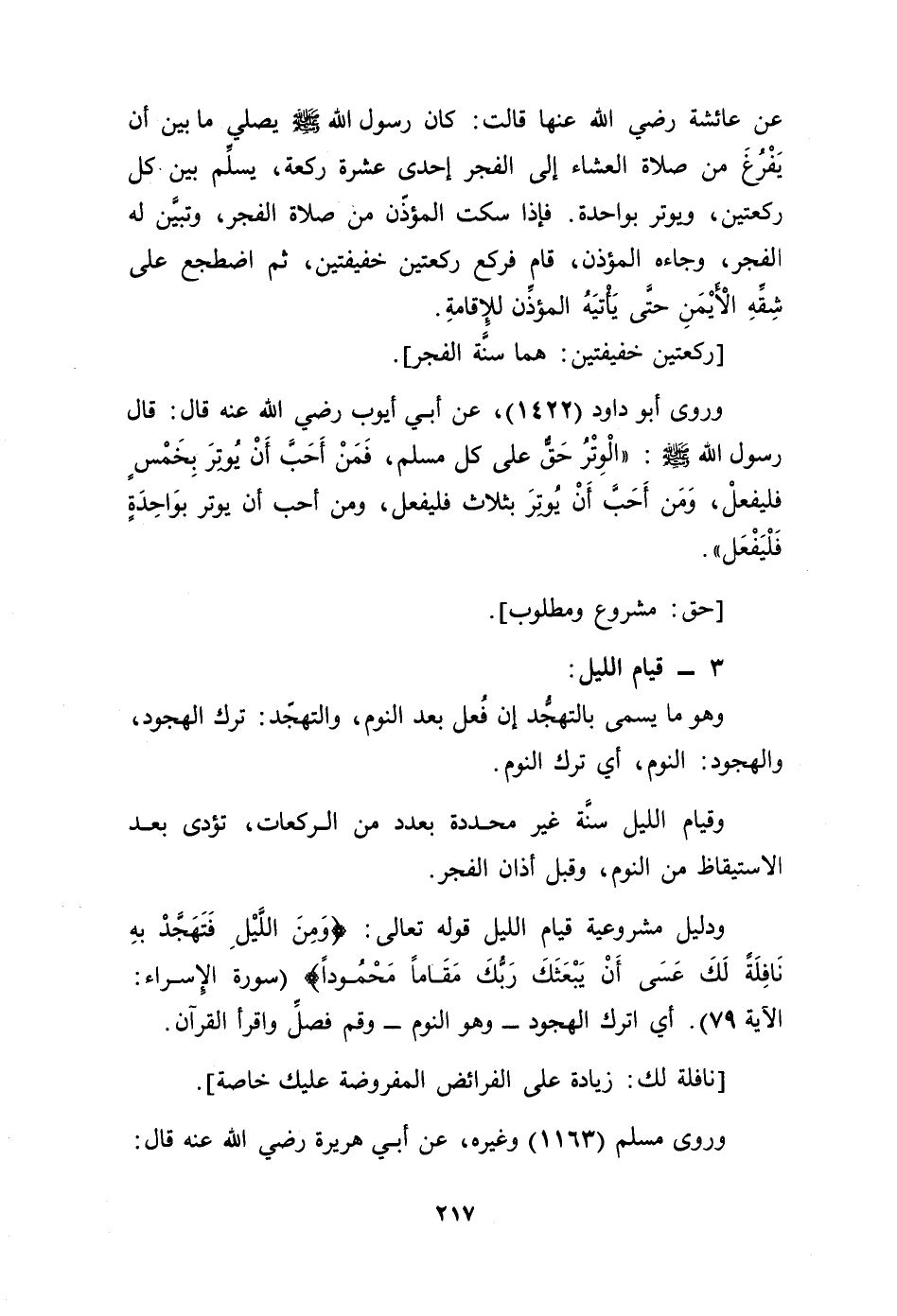عن عائشة رضي الله عنها قالت: كان رسول الله - صلى الله عليه وسلم - يصلي ما بين أن يفرغ من صلاة العشاء إلى الفجر إحدى عشرة ركعة، يسلم بين كل ركعتين، ويوتر بواحدة. فإذا سكت المؤذن من صلاة الفجر، وتبين له الفجر، وجاءه المؤذن، قام فركع ركعتين خفيفتين، ثم اضطجع على شقه الإيمان حتى يأتيه المؤذن للإقامة.