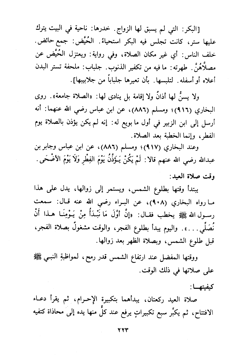 [البكر: التي لم يسبق لها الزواج. خدرها: ناحية في البيت يترك عليها ستر، كانت تجلس في البكر استحياءً. الحُيَّض: جمع حائض. خلف الناس: أي غير مكان الصلاة، وفي رواية: ويعتزل الحُيّض عن مصلاَّهُنَّ. طهرته: ما فيه من تكفير الذنوب. جلباب: ملحفة تستر البدن أعلاه أو أسفله. لتلبسها: بأن تعيرها جلباباً من جلابيبها].