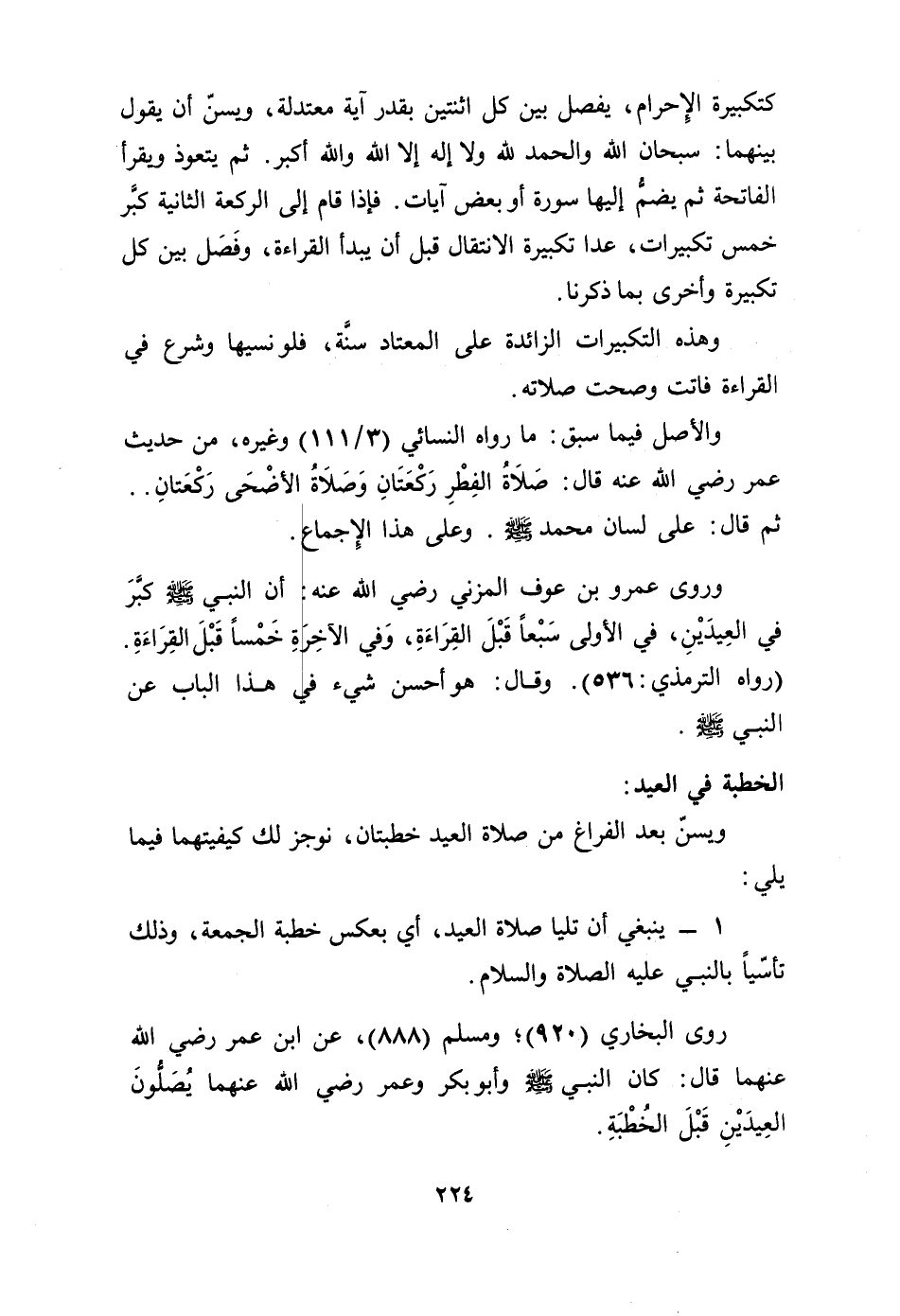 وروى عمرو بن عوف المزني - رضي الله عنه -: أن النبي - صلى الله عليه وسلم - كبّر في العيدين، في الأولى سبعاً قبل القراءة، وفي الآخرة خمساً قبل القراءة. (رواه الترمذي: 536). وقال: هو أحسن شيء في هذا الباب عن النبي - صلى الله عليه وسلم -. ...