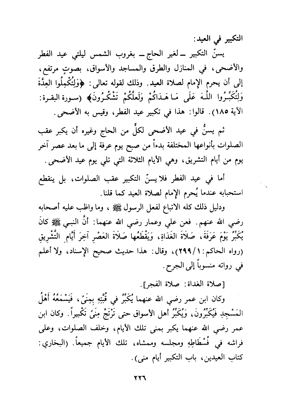ودليل ذلك كله لاتباع لفعل الرسول - صلى الله عليه وسلم -، وما واظب عليه أصحابه رضي الله عنهم. فعن علي وعمار رضي الله عنهما: أم النبي - صلى الله عليه وسلم - كان يكبر يوم عرفة، صلاة الغداة، ويقطعها صلاة العصر آخر أيام التشريق (رواه الحاكم: 1/ 229)، وقال: هذا حديث صحيح الإسناد، ولا أعلم في رواته منسوباً إلى الجرح.