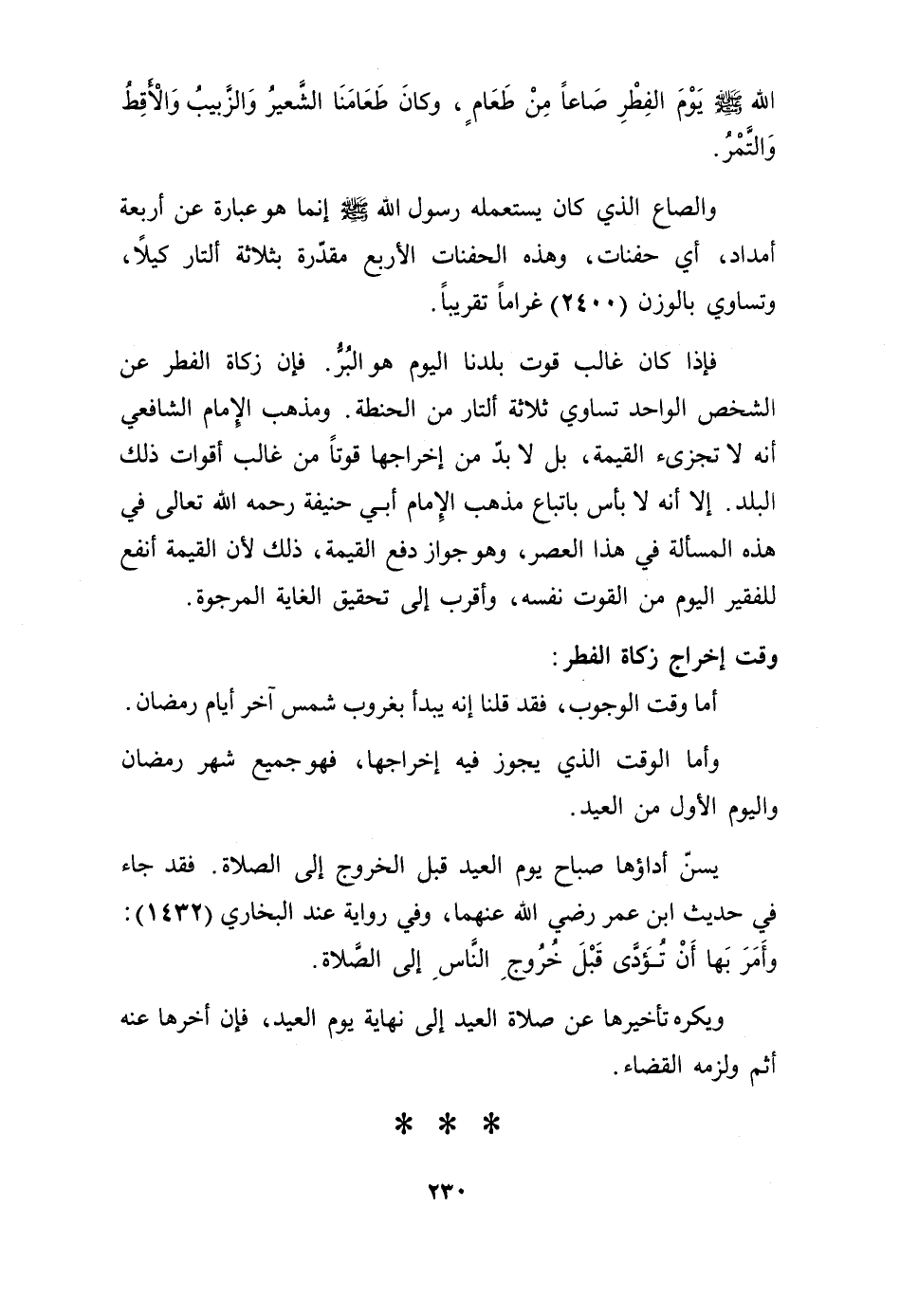 فإذا كان غالب قوت بلدنا اليوم هو البُرُّ. فإن زكاة الفطر عن الشخص الواحد تساوي ثلاثة ألتار من الحنطة. ومذهب الإمام الشافعي أنه لا تجزئ القيمة، بل لا بدّ من إخراجها قوتاً من غالب أقوات ذلك البلد. إلا أنه لا بأس باتباع مذهب الإمام أبي حنيفة رحمه الله تعالى في هذه المسألة في هذا العصر، وهو جواز دفع القيمة، ذلك لأن القيمة أنفع للفقير اليوم من الفقير نفسه، واقرب إلى تحقيق الغاية المرجوة.