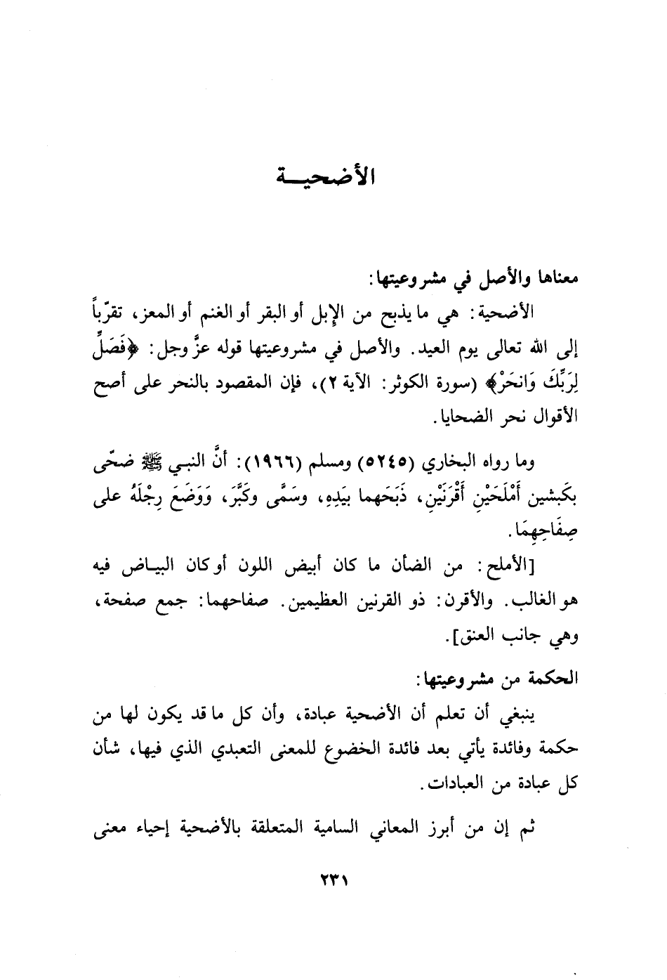 الأضحية: هي ما يذبح من الإبل أو البقر أو الغنم أو المعز، تقرباً إلى الله تعالى يوم العيد. والأصل في مشروعيتها قوله عز وجل: {فصل لربك وانحر} [الكوثر: 2]، فإن المقصود بالنحر على أصح الأقوال نحر الضحايا.