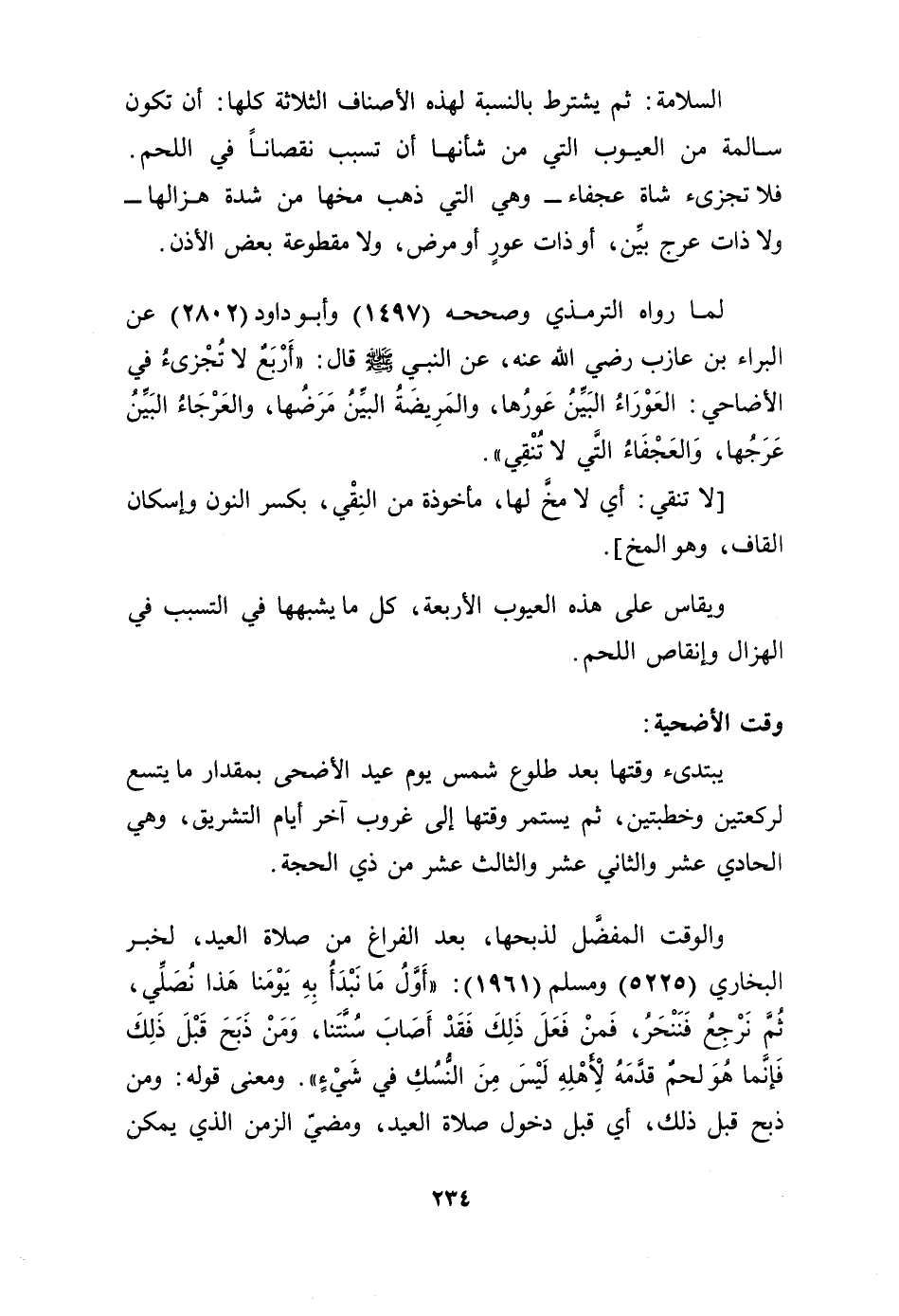 السلامة: ثم يشترط بالنسبة لهذه الأصناف الثلاثة كلها: أن تكون سالمة من العيوب التي من شأنها أن تسبب نقصاناً في اللحم: فلا تجزئ شاة عجفاء - وهي التي ذهب مخها من شدة هزالها- ولا ذات عرج بيِّن، أو ذات عورٍ أو مرض، ولا مقطوعة بعد الأذن. ... لما رواه الترمذي وصححه (1497) وأبو داود (2802) عن البراء بن عازب - رضي الله عنه - عن النبي - صلى الله عليه وسلم - قال: " أربع لا تجزئ في الأَضاحي: العوراء البين عورها، والمريضة البين مرضها، والعرجاء البين عرجها، والعجفاء التي لا تنقي ".