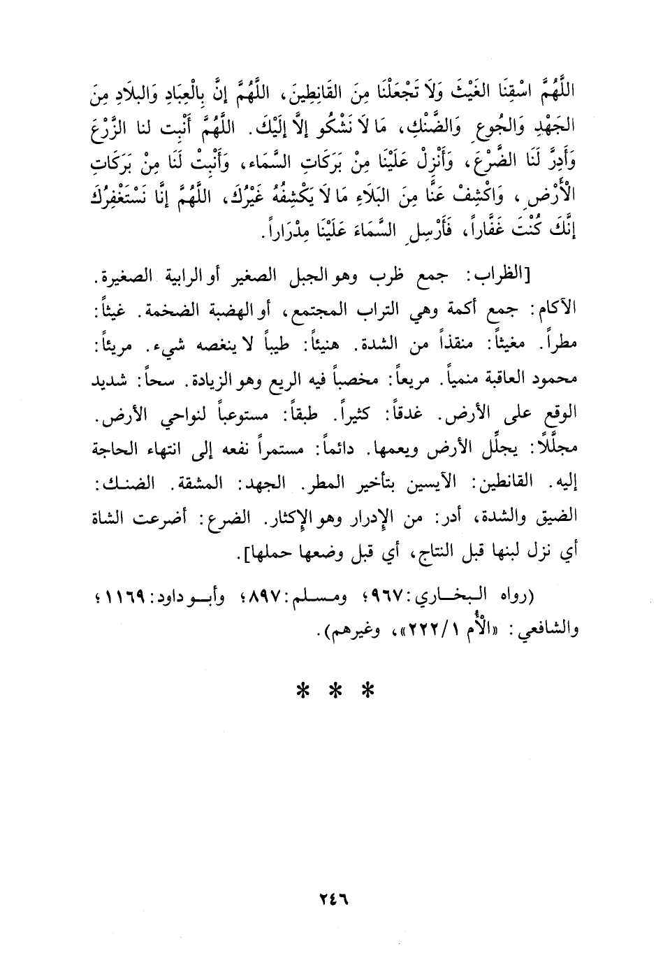[الظراب: جمع ظرب وهو الجبل الصغير أو الرابية الصغيرة. الآكام: جمع أكمة وهي التراب المجتمع، أو الهضبة الضخمة. غيثاً: مطراً. مغيثاً: منقذاً من الشدة. هنيئاً: طيباً لا ينغصه شئ. مريئاً: محمود العاقبة منمياً. مريعاً: مخصباً فيه الريع وهو الزيادة. سحاً شديد الوقع على الأرض. غدقاً: كثيراً. طبقاً: مستوعباً لنواحي الأرض.