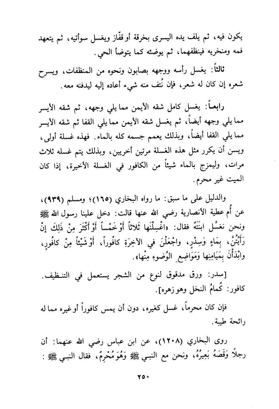والدليل على ما سبق: ما رواه البخاري (156)؛ ومسلم (939)، عن أم عطية الأنصارية رضي الله عنها قالت: دخل علينا رسول الله - صلى الله عليه وسلم - ونحن نغسل ابنته فقال: " اغسلنها ثلاثاً أو خمساً أو أكثر من ذلك إن رأيتن، بماء وسدر، واجعلن في الآخرة كافوراً، وشيئاً من كافور، وابدأن بميامنها ومواضع الوضوء منها".