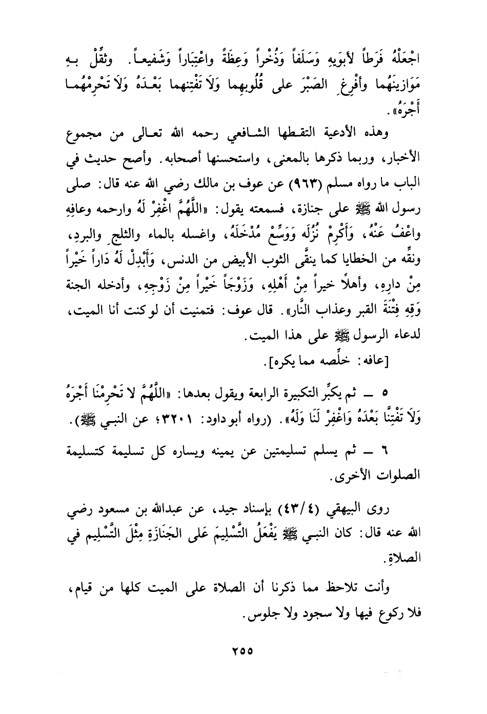 وهذه الأدعية التقطها الشافعي رحمه الله تعالى من مجموع الأخبار، وربما ذكرها بالمعنى، واستحسنها أصحابه, وأصح حديث في الباب ما رواه مسلم (963) عن عوف بن مالك - رضي الله عنه - قال: صلى رسول الله - صلى الله عليه وسلم - على جنازة، فسمعته يقول: " اللهم اغفر له وارحمه وعافه واعف عنه، وأكرم نزله ووسع مدخله، واغسله بالماء والثلج والبرد، ونقه من الخطايا كما ينقي الثوب الأبيض من الدنس، وأبدل له داراً خيراً من داره، وأهلاً خيراً من أهله، وزوجاً خيراً من زوجه، وأدخله الجنة وقه فتنة القبر وعذاب النار". قال عوف: فتمنين أن لو كنت أنا الميت، لدعاء الرسول - صلى الله عليه وسلم - على هذا الميت.