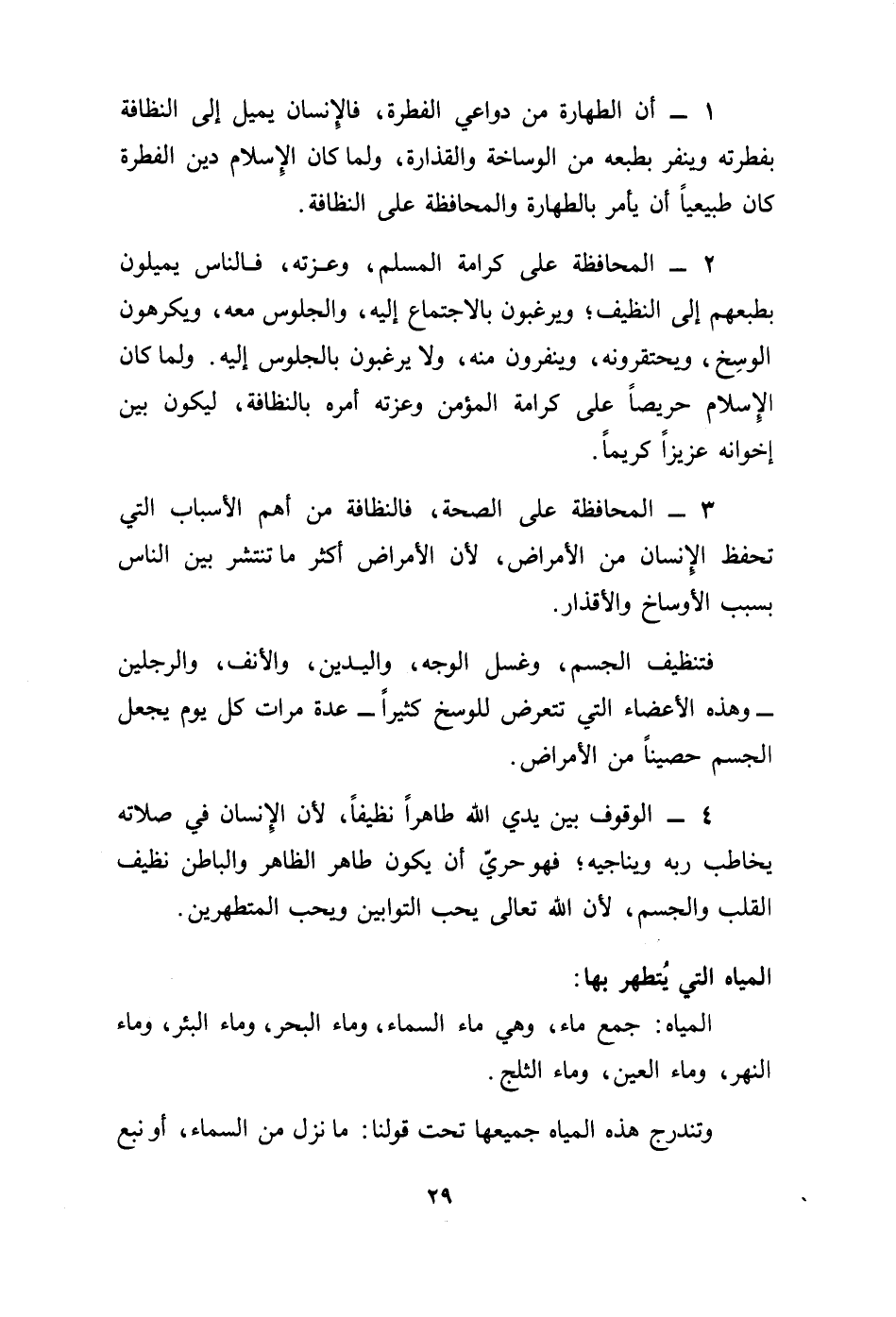 4 - الوقوف بين يدي الله طاهراً نظيفاَ، لأن الإنسان في صلاته يخاطب ربه ويناجيه، فهو حرَ أن يكون طاهر الظاهر والباطن نظيف القلب والجسم، لأن الله تعالى يحب التوابين ويحب المتطهرين.