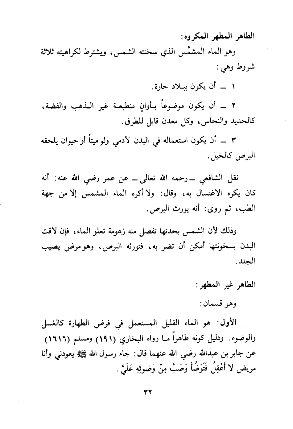 نقل الشافعي ـ رحمه الله تعالى ـ عن عمر - رضي الله عنه -: أنه كان يكره الاغتسال به، وقال: ولا أكره الماء المشمس إلا من جهة الطب، ثم روى: أنه يورث البرص.