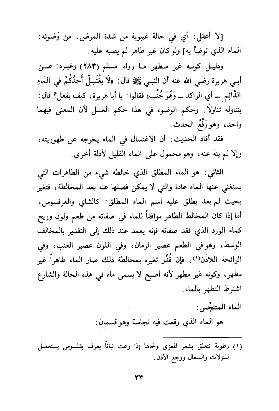 الثاني: هو الماء المطلق الذي خالطه شيء من الطاهرات التي يستغني عنها الماء عادة والتي لا يمكن فصلها عنه بعد المخالطة، فتغير بحيث لم يعد يطلق عليه أسم الماء المطلق: كالشاي والعرقسوس، أما إذا كان المخلط الطاهر موافقا للماء في صفاته من طعم ولون وريح كماء الورد الذي فقد صفاته فإنه يعمد عند ذلك إلى التقدير بالمخالف الوسط، وهو في الطعم عصير الرمان، وفي اللون عصير العنب، وفي الرائحة اللاذن (¬1)، فإن قدر تغيره بمخالطة ذلك صار الماء طاهراً غير مطهر، وكونه غير مطهر لأنه أصبح لا يسمى ماء في هذه الحالة والشارع اشترط التطهر بالماء.